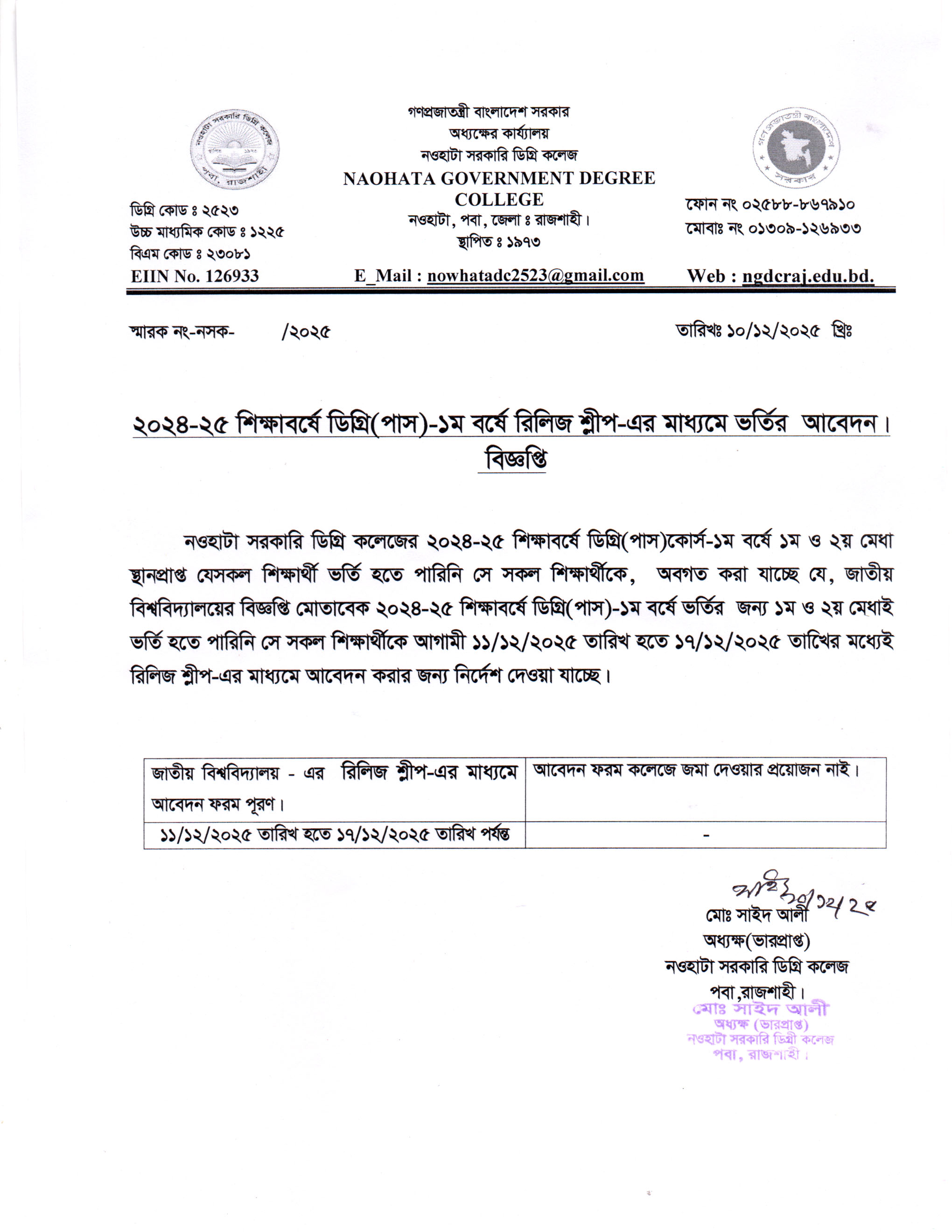 ডিগ্রি (পাস) ১ম বর্ষ ২০২৪-২৫ শিক্ষাবর্ষের রিলিজ স্লিপের মাধ্যমে ভর্তি সংক্রান্ত |