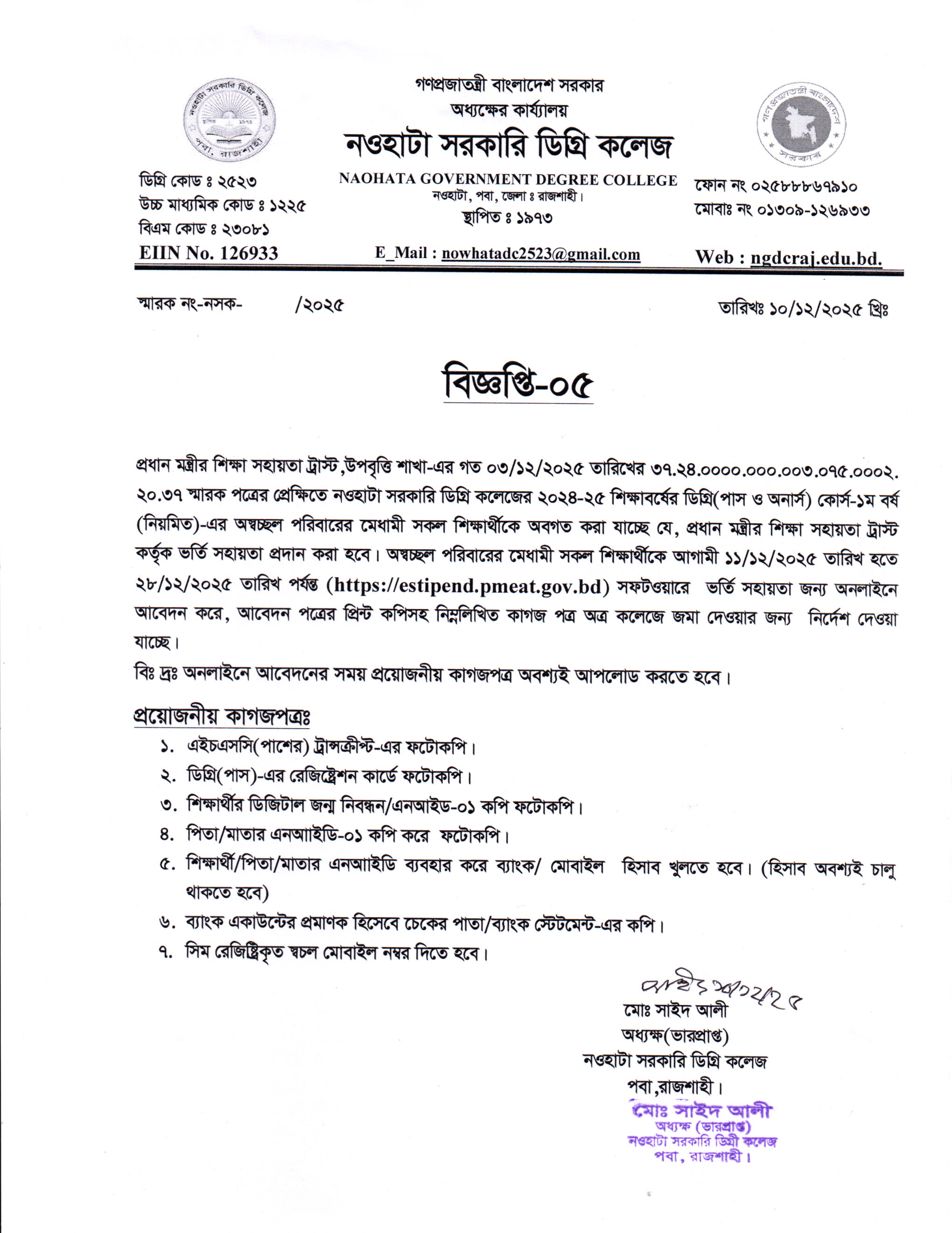 নওহাটা সরকারি ডিগ্রি কলেজে অধ্যয়নরত বৃত্তিপ্রাপ্ত সকল শিক্ষার্থীদের অবগতির জন্য |