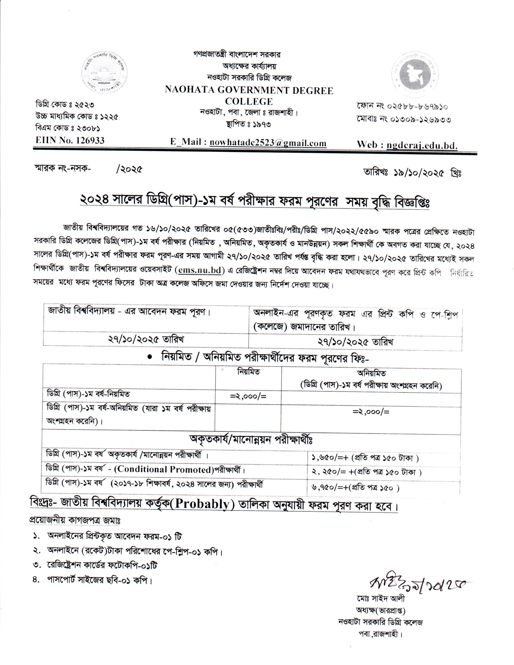 ২০২৪ সালের ডিগ্রি (পাস) ১ম বর্ষ  পরীক্ষার  ফরম পূরণের সময় বৃদ্ধি সংক্রান্ত