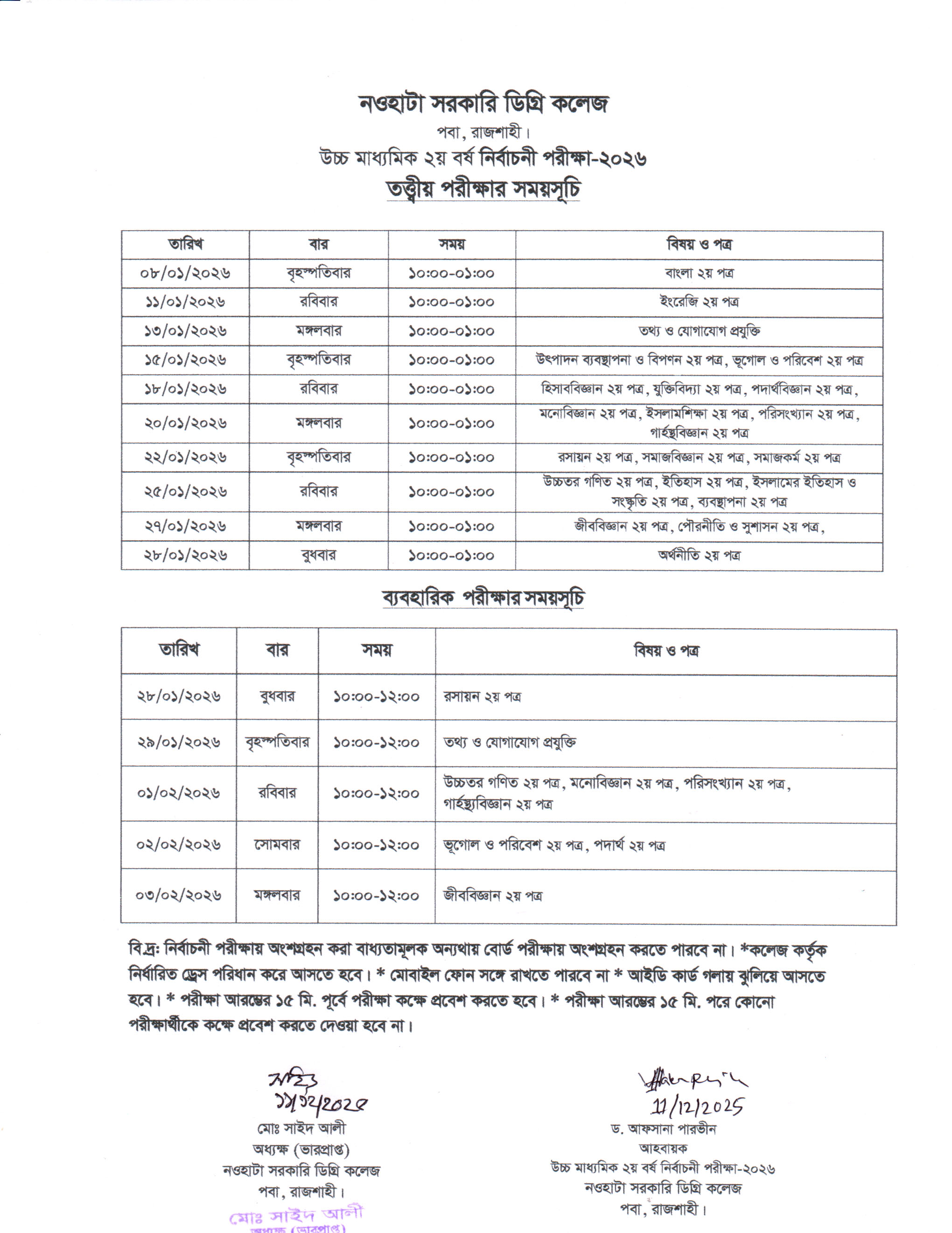 “উচ্চ মাধ্যমিক ২য় বর্ষ নির্বাচনী পরীক্ষা-২০২৫”  এর সময়সূচি