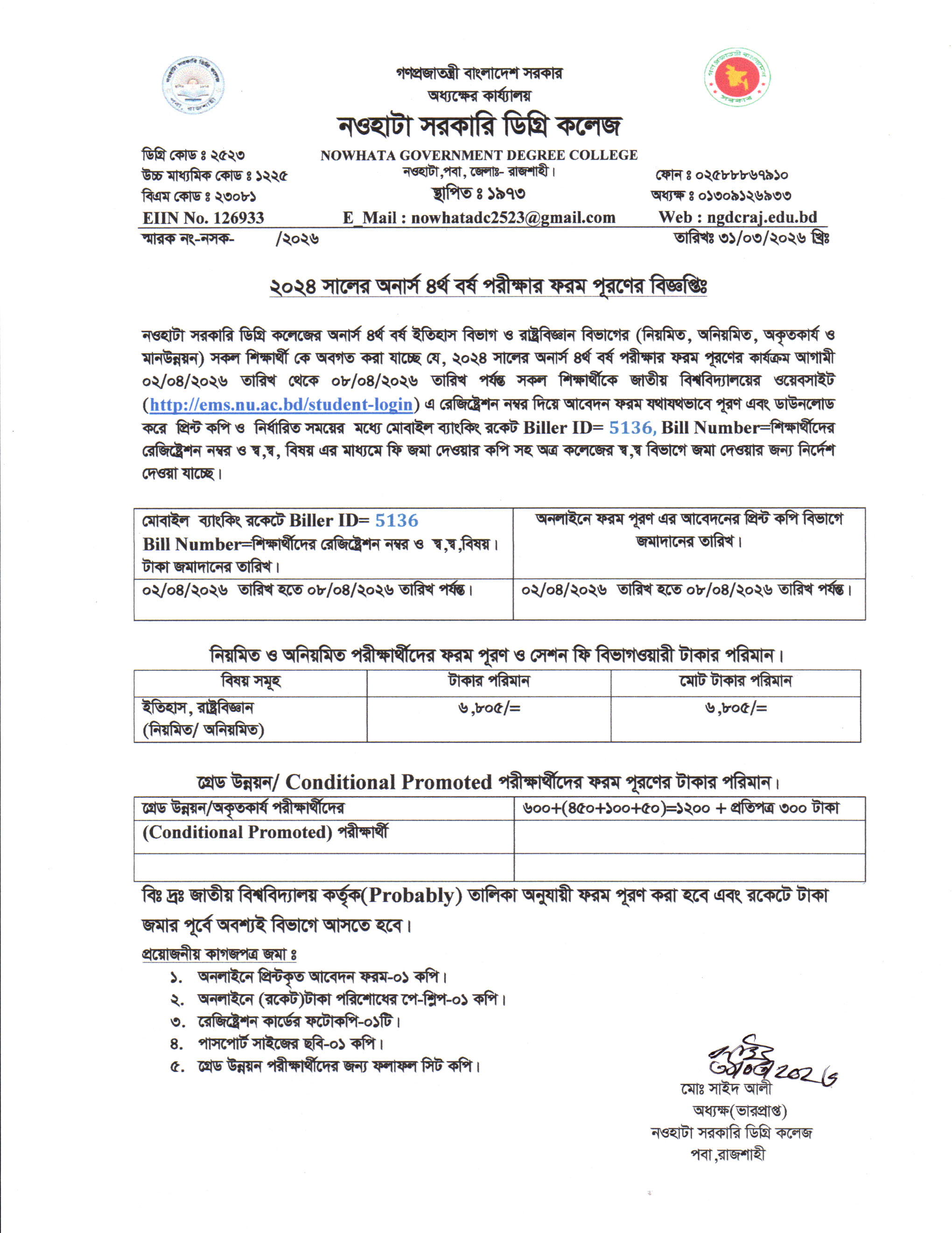 ২০২৪ সালের অনার্স ৪র্থ বর্ষ পরীক্ষার ফরম পূরণের বিজ্ঞপ্তি