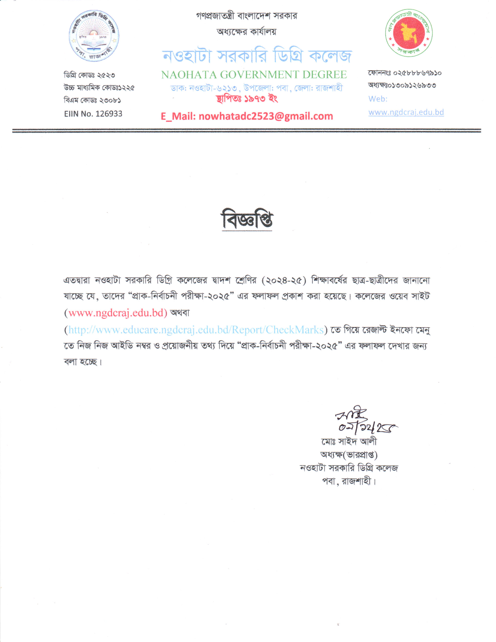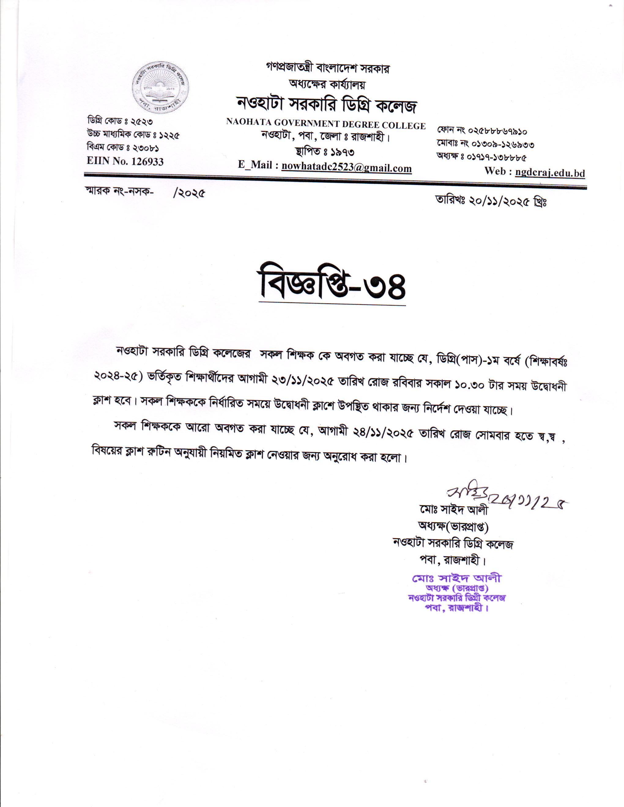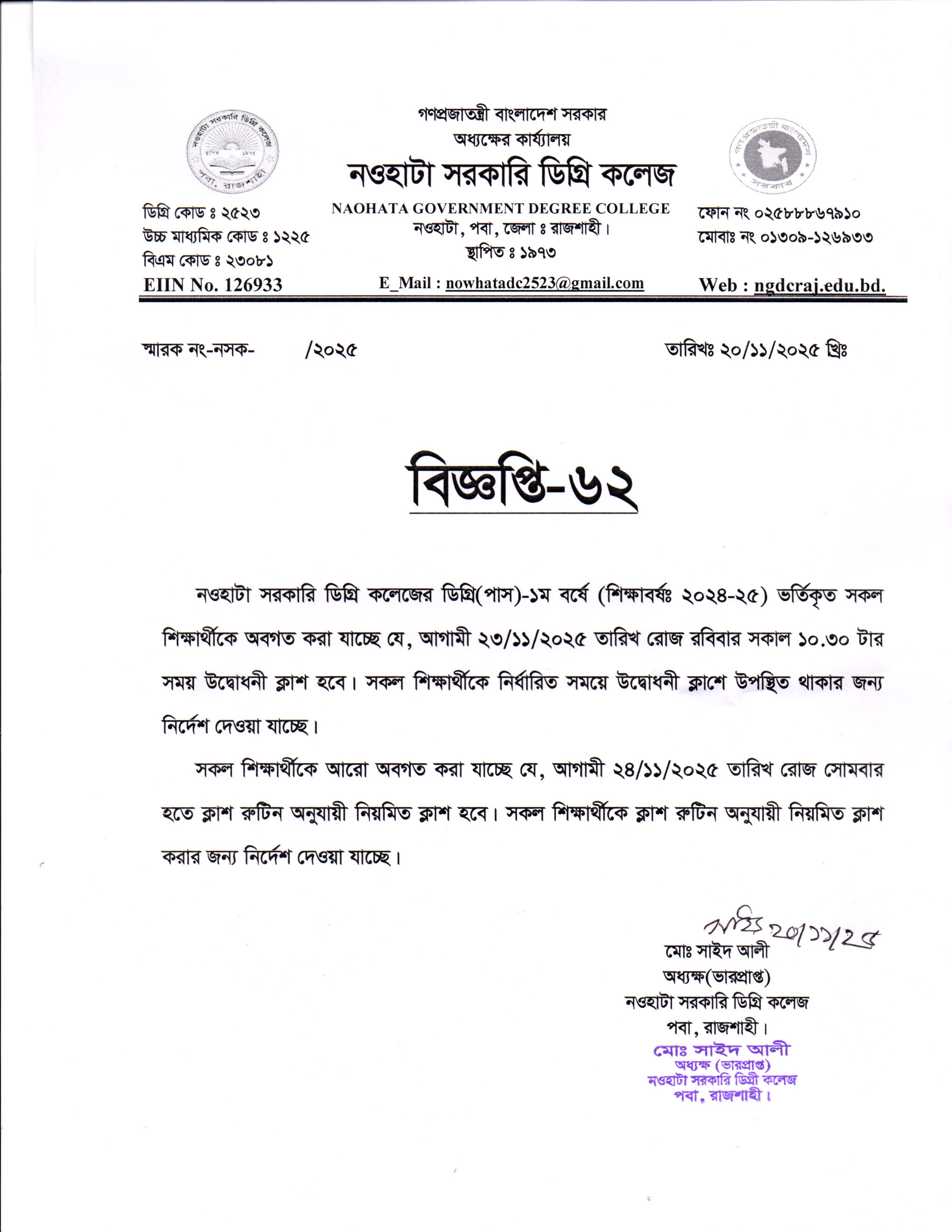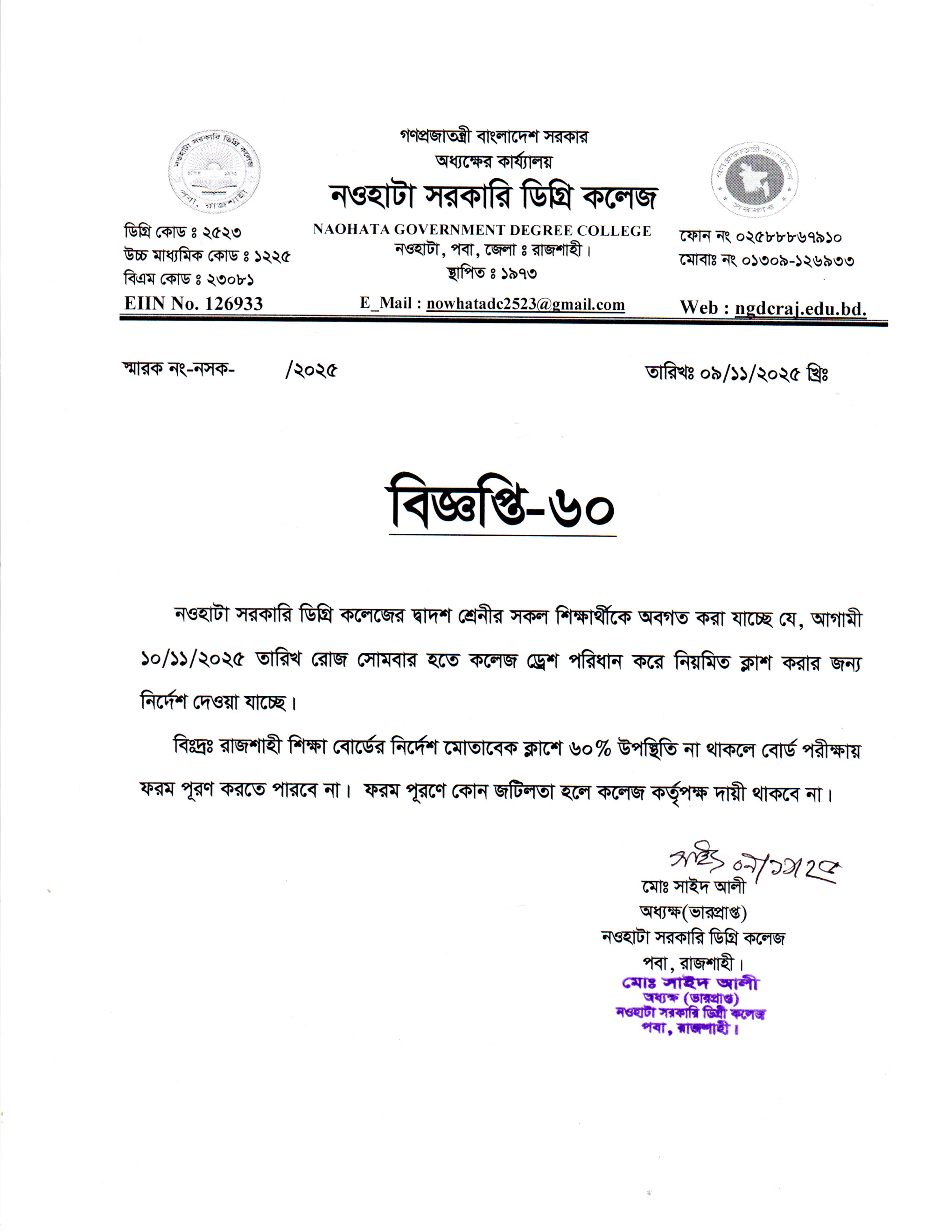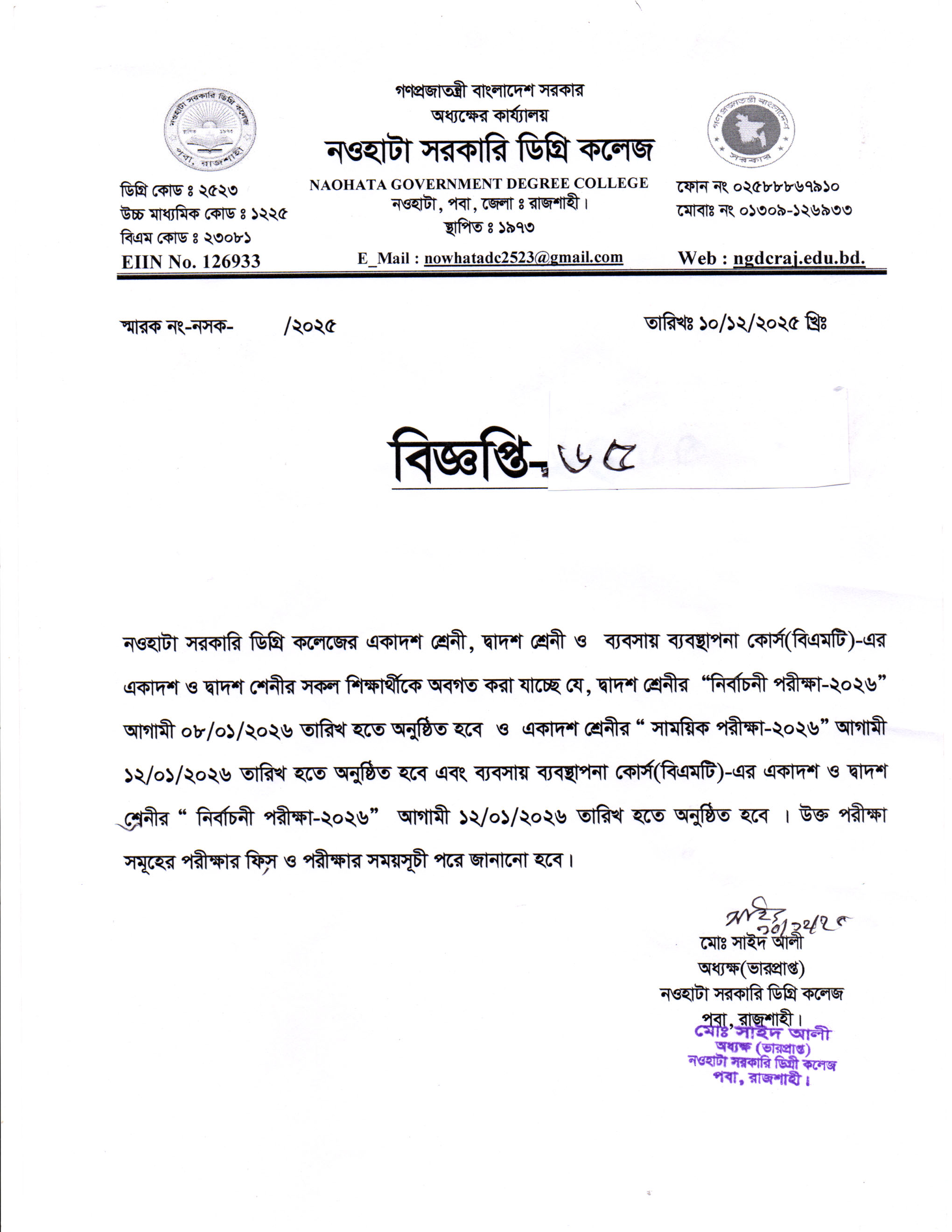 নওহাটা সরকারি ডিগ্রি কলেজের সকল শিক্ষার্থীর অবগতির জন্য |