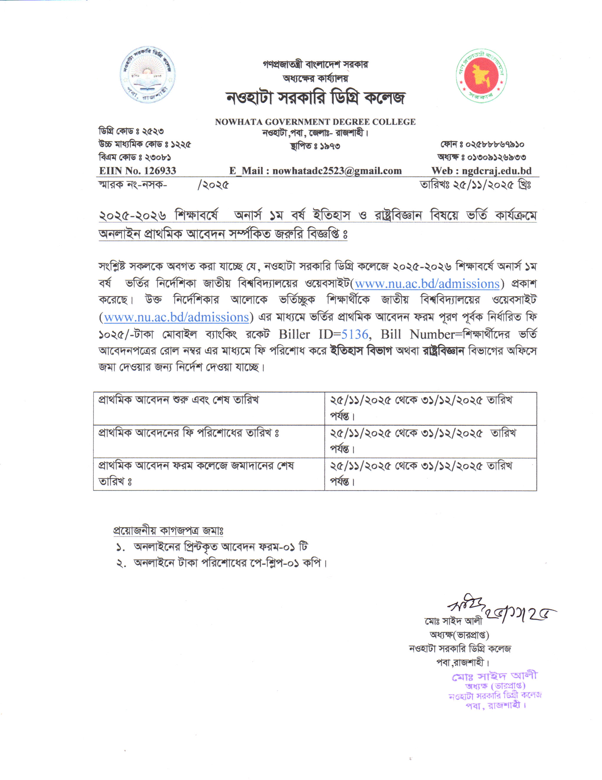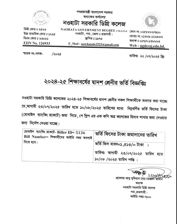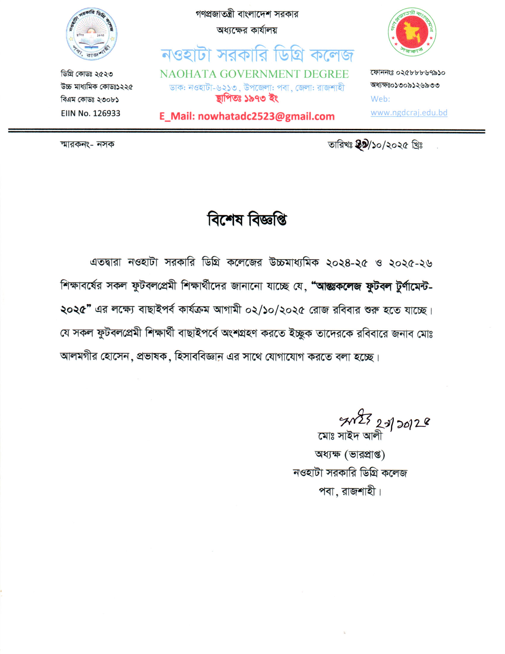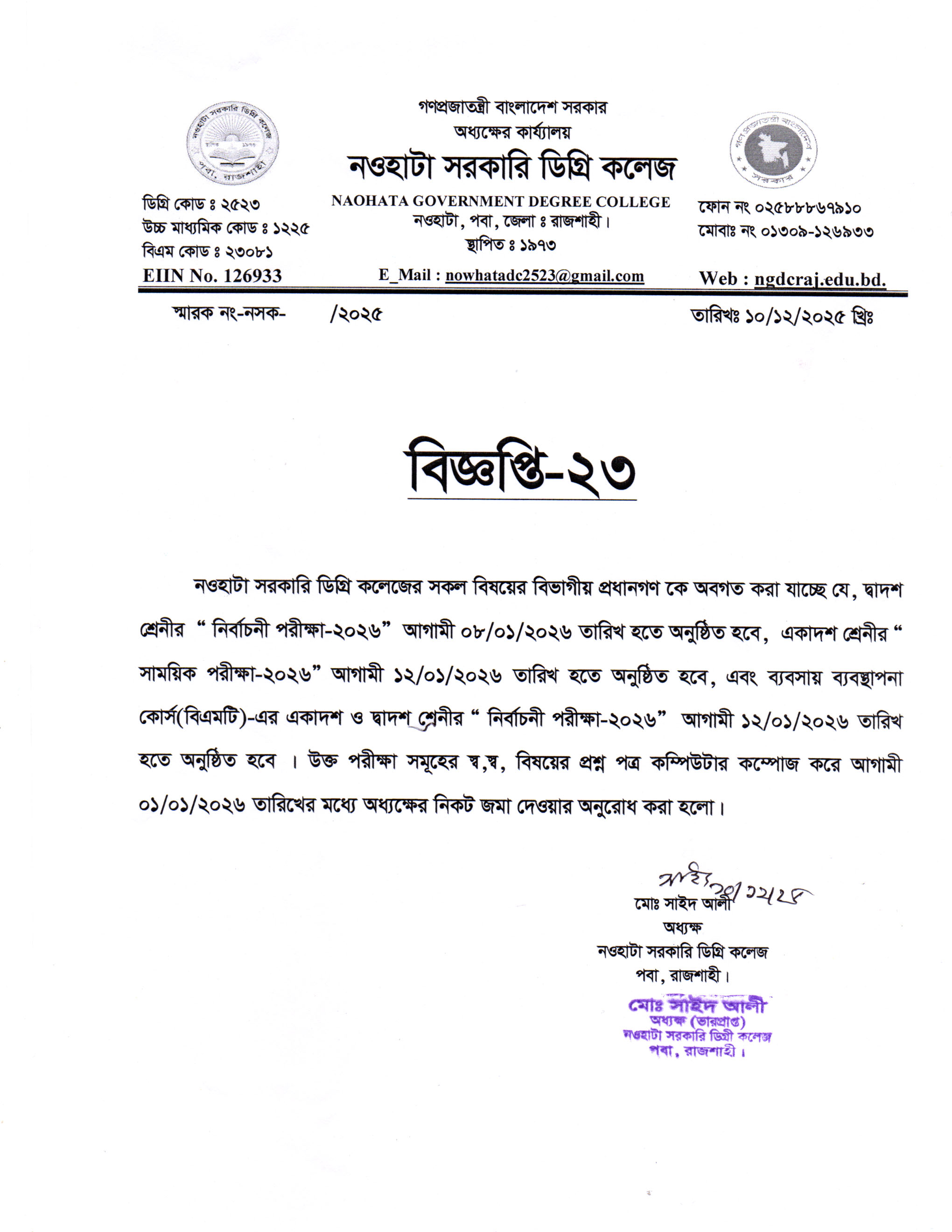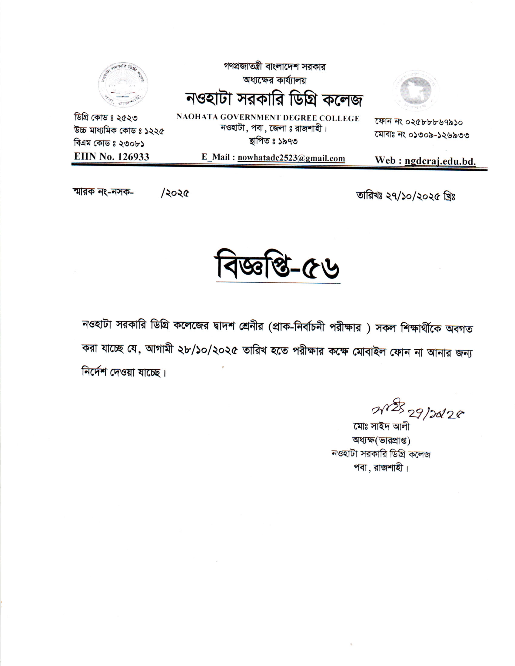 নওহাটা সরকারি ডিগ্রি কলেজের সকল শিক্ষার্থীর অবগতির জন্য |