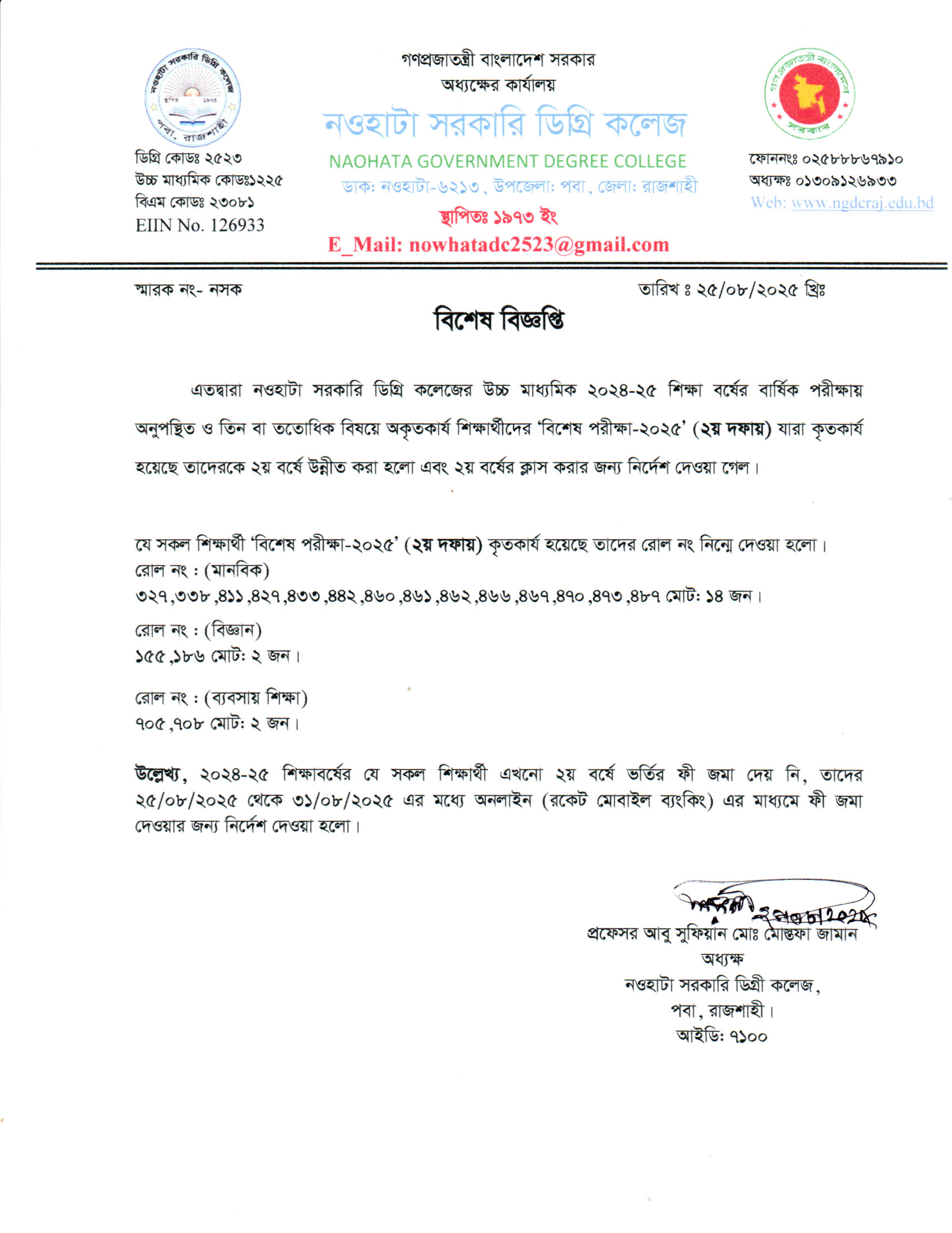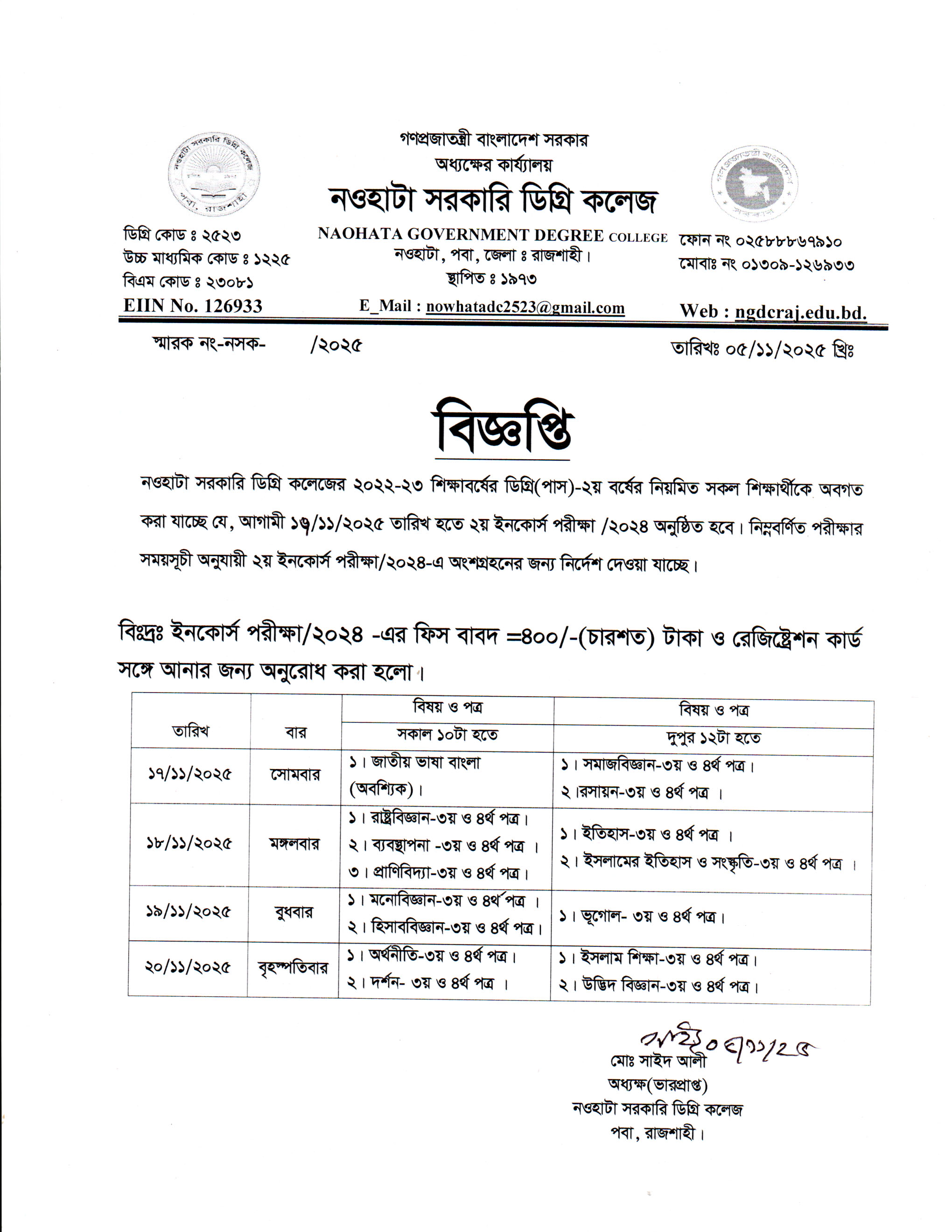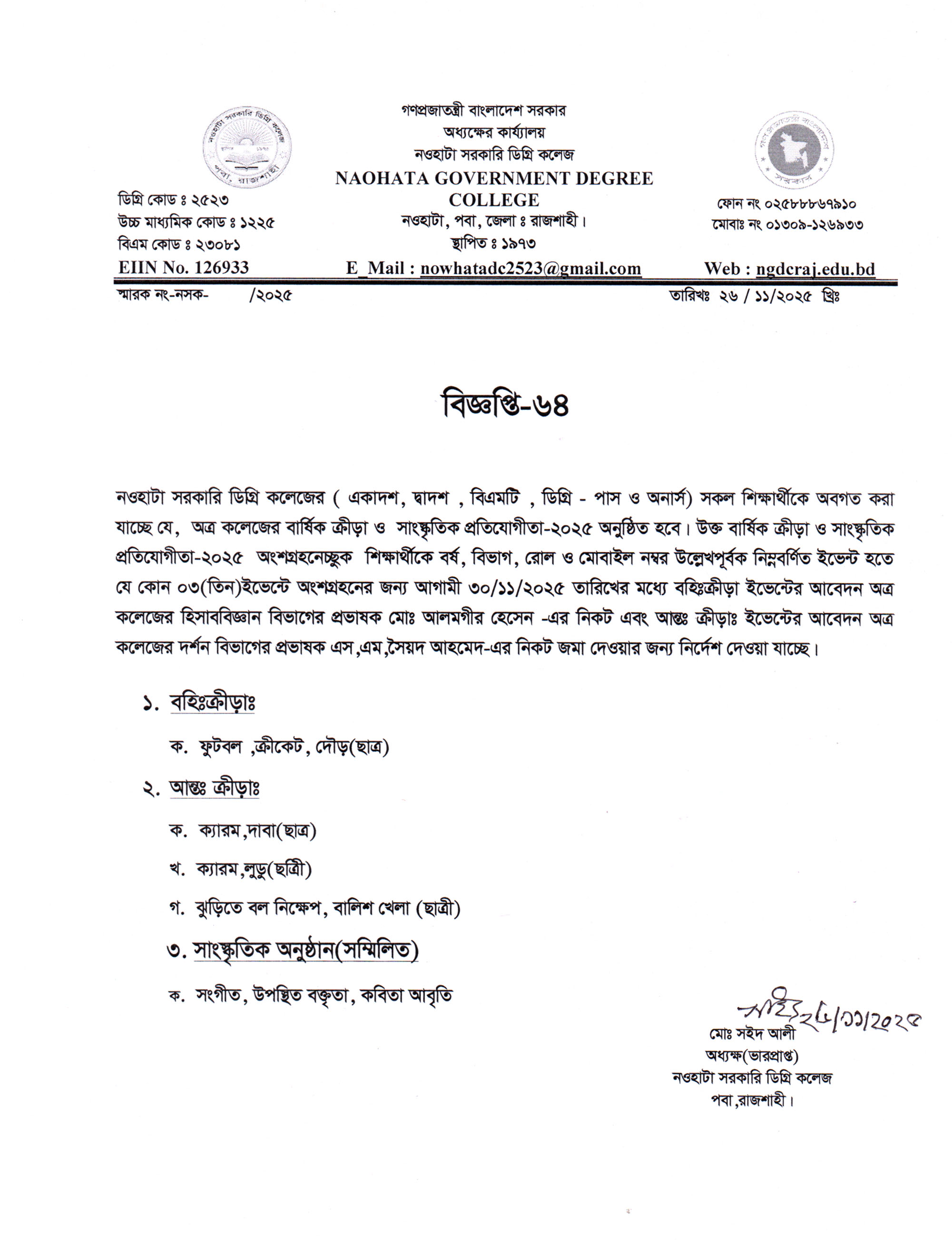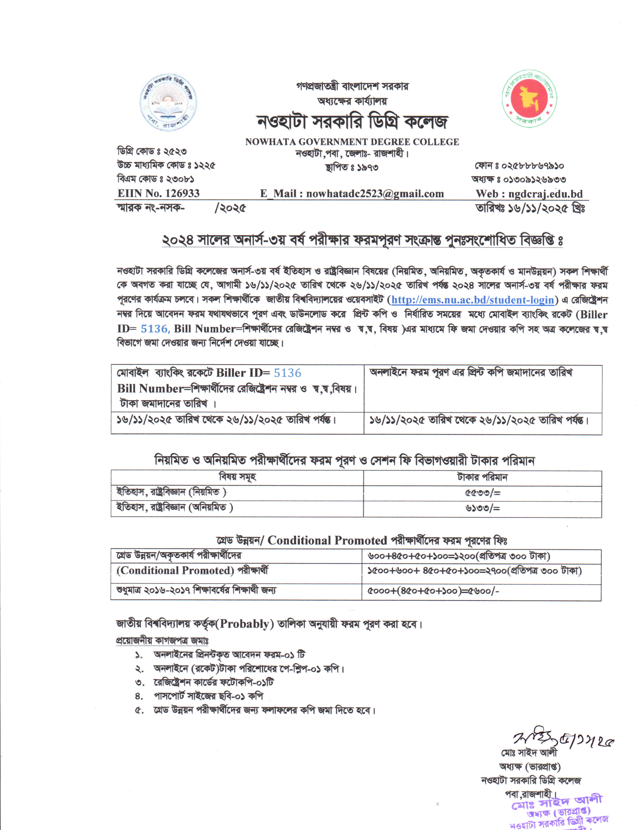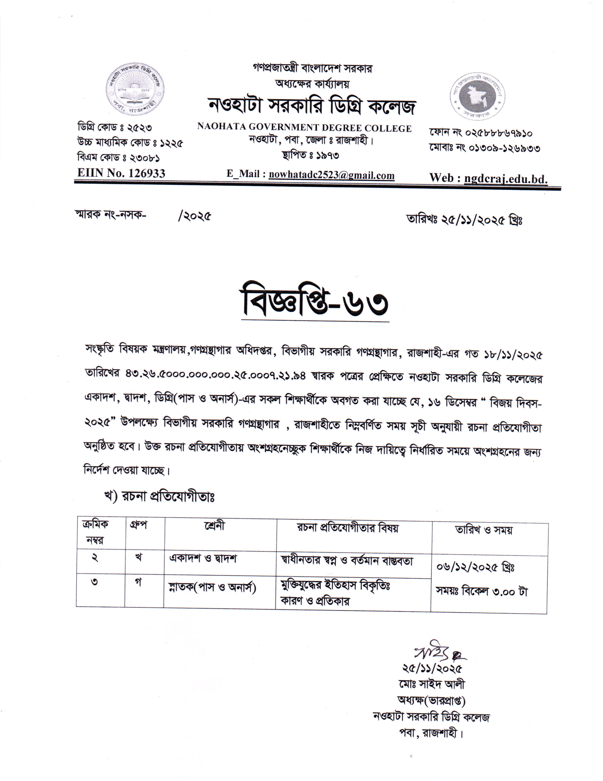 নওহাটা সরকারি ডিগ্রি কলেজের সকল শিক্ষার্থীর অবগতির জন্য |