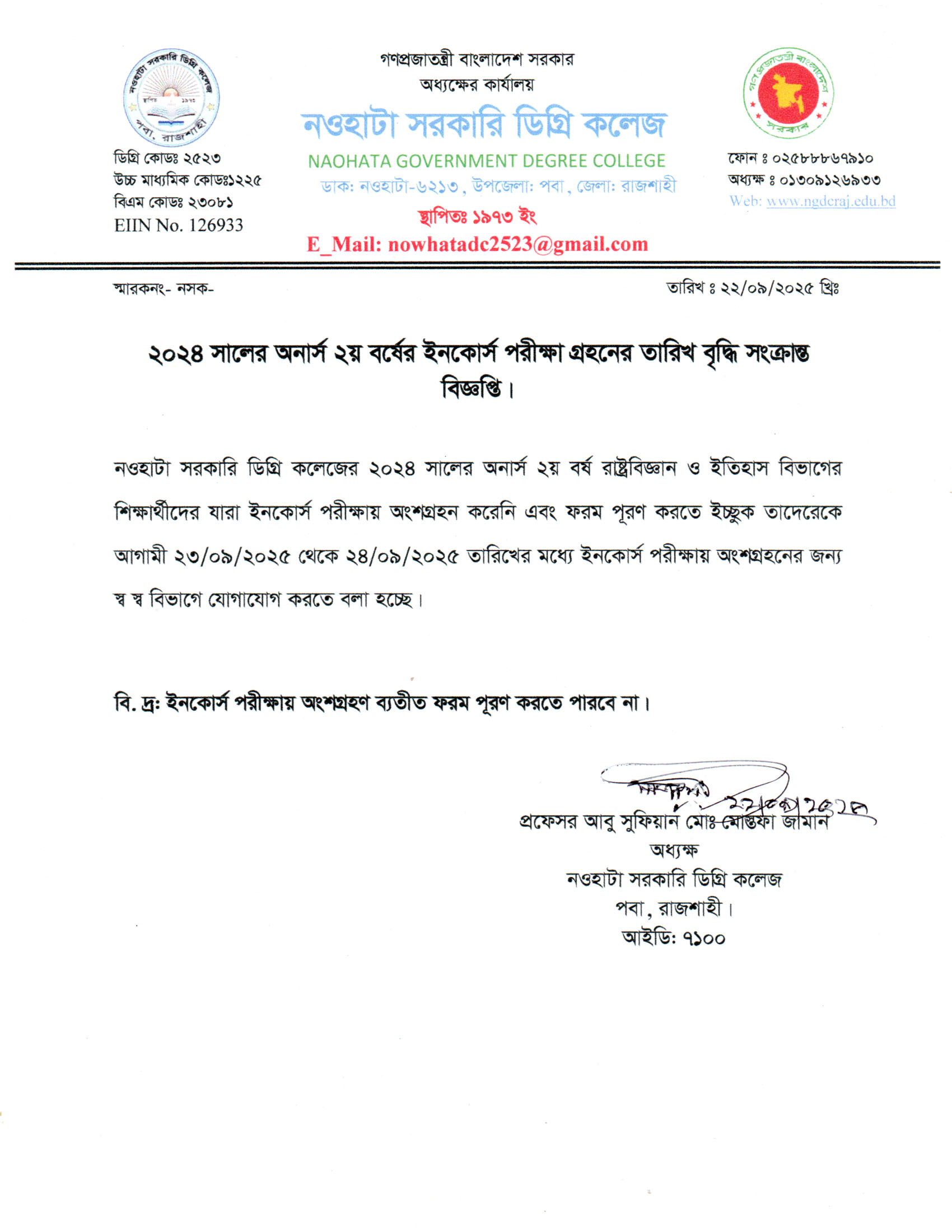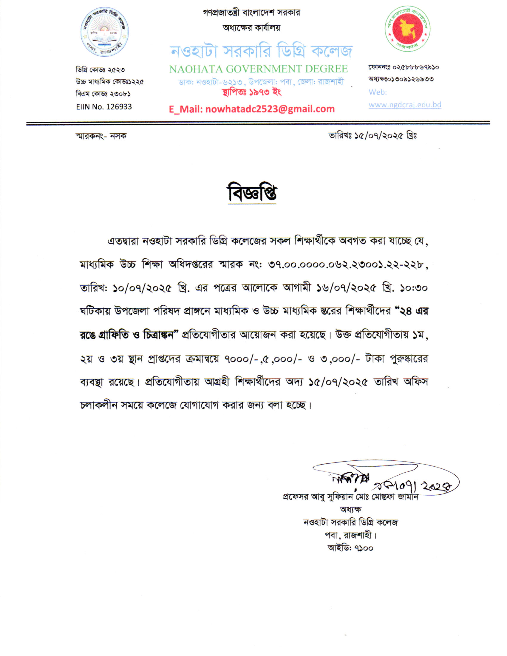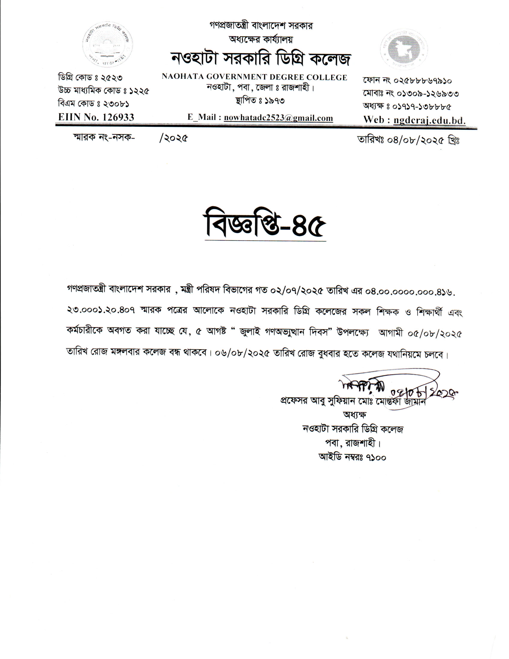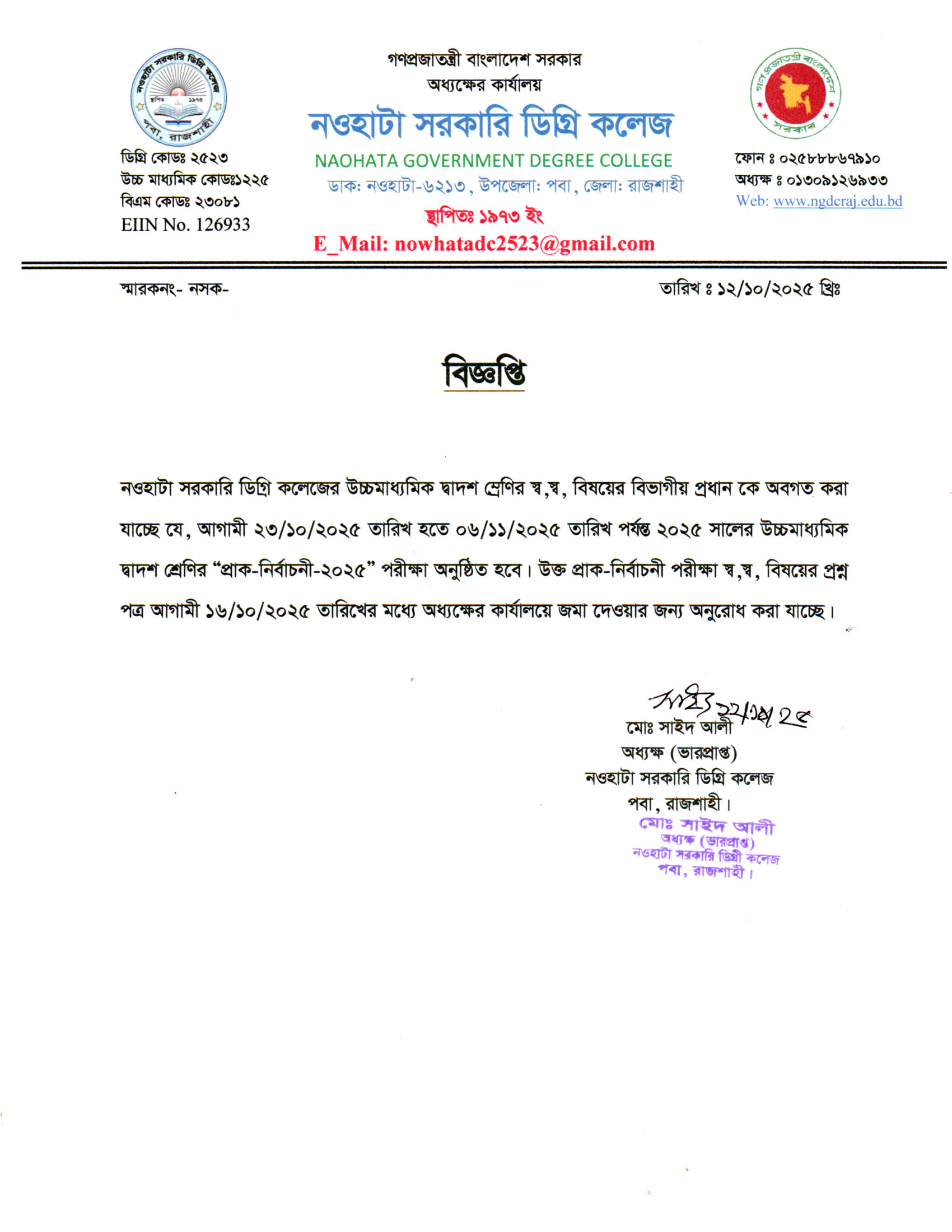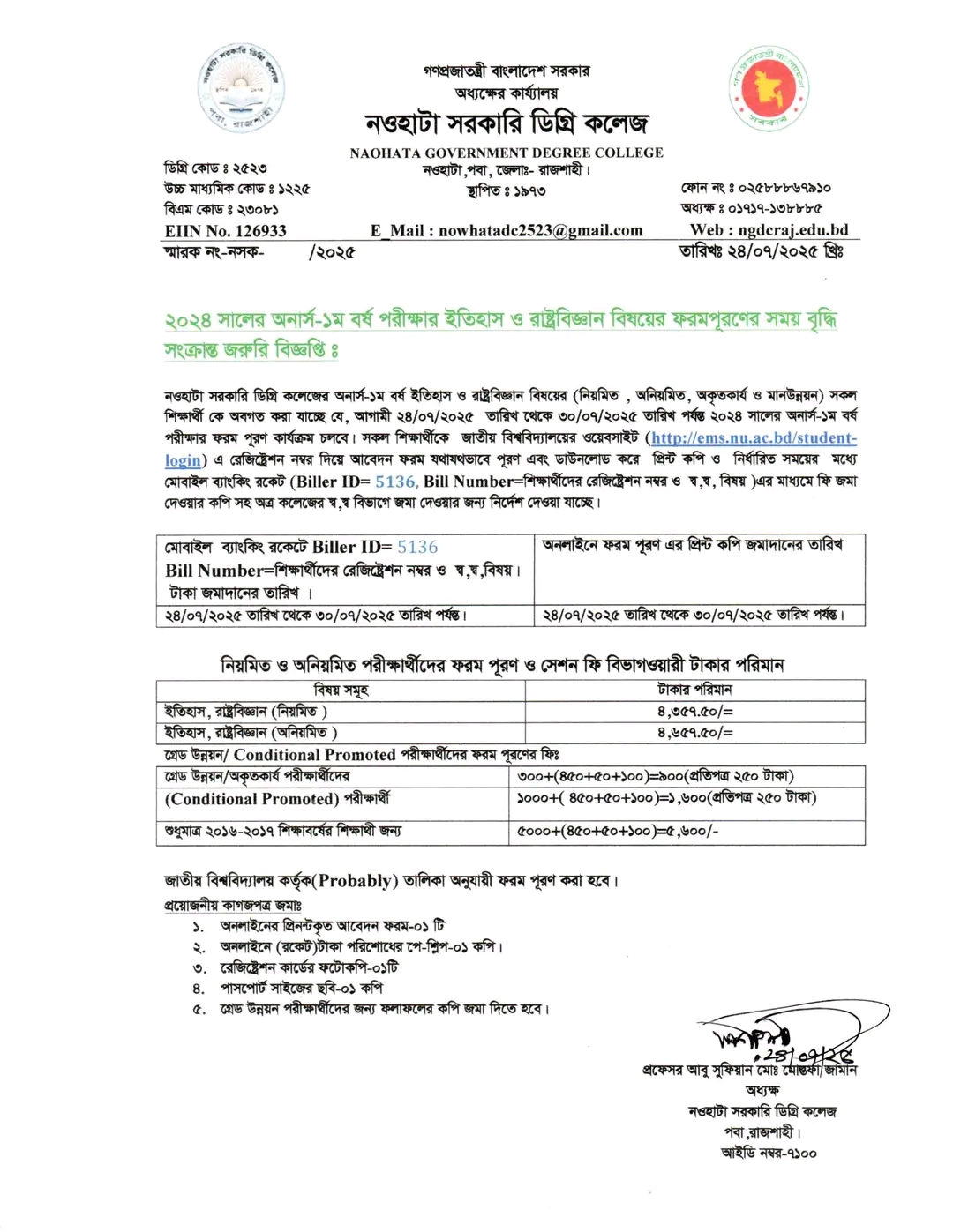 নওহাটা সরকারি ডিগ্রি কলেজের সকল শিক্ষার্থীর অবগতির জন্য |