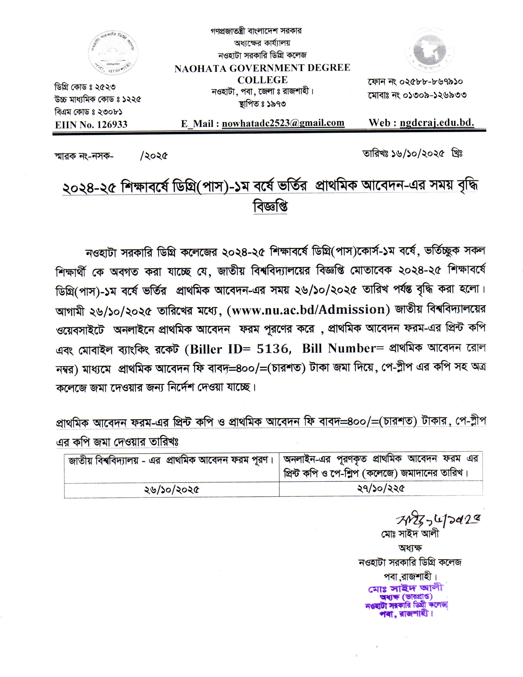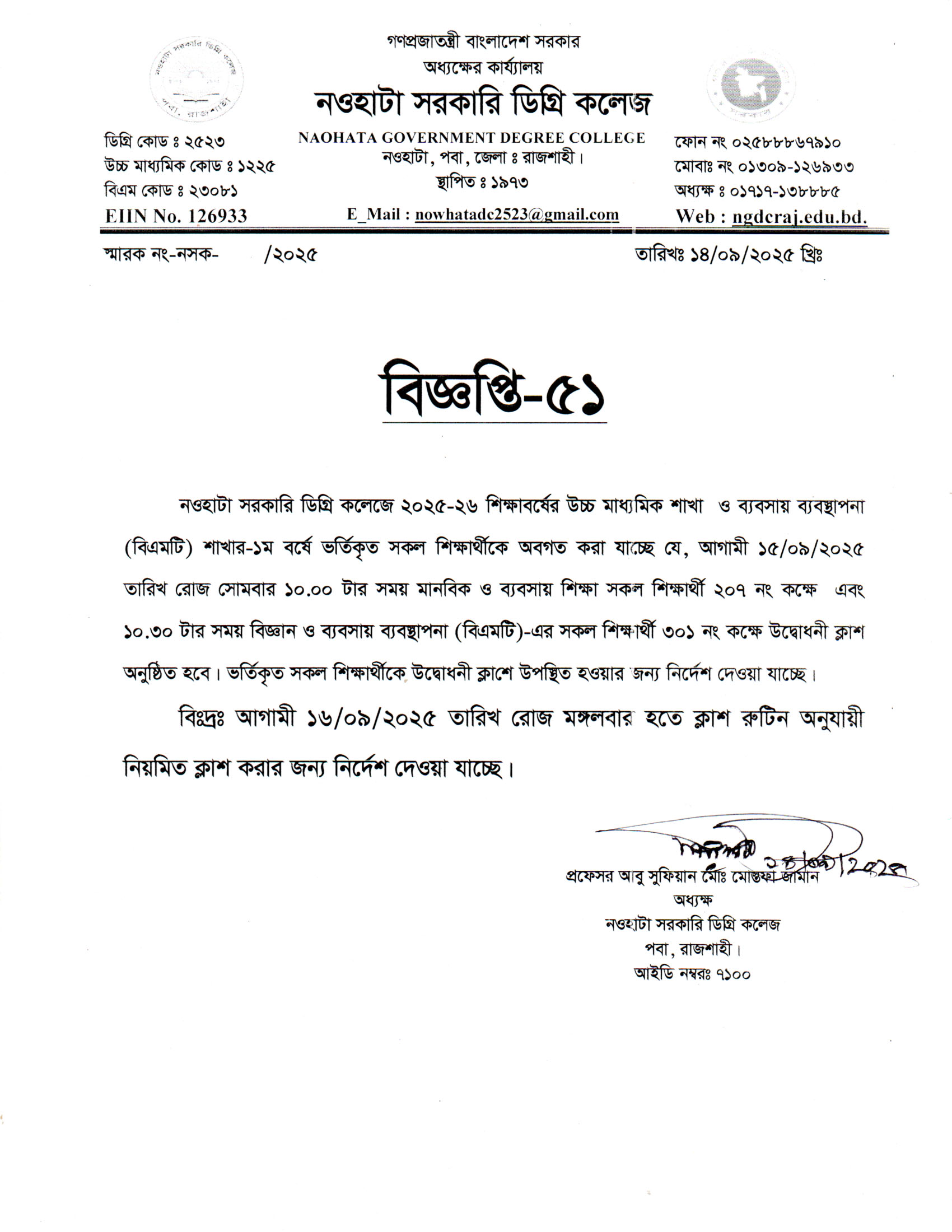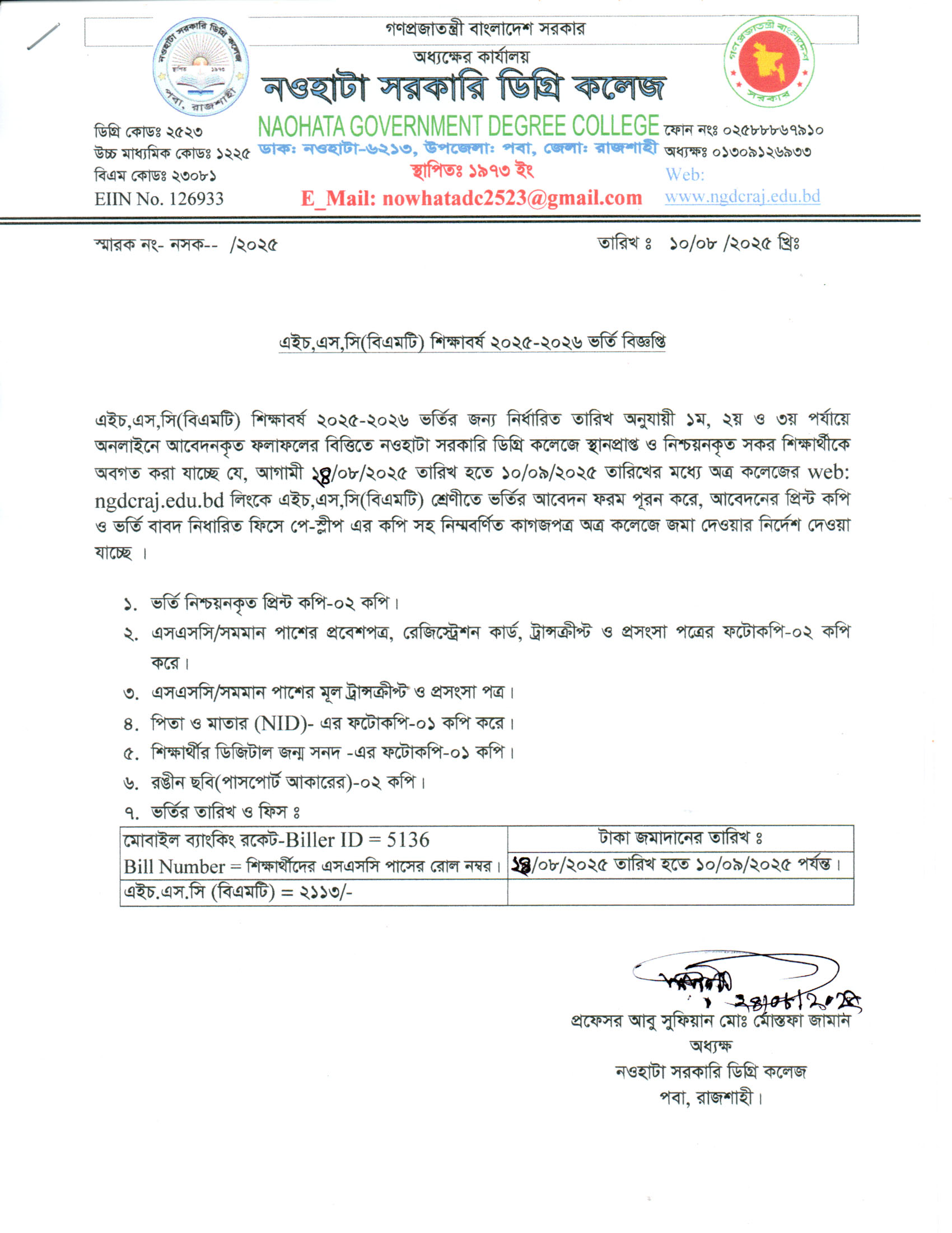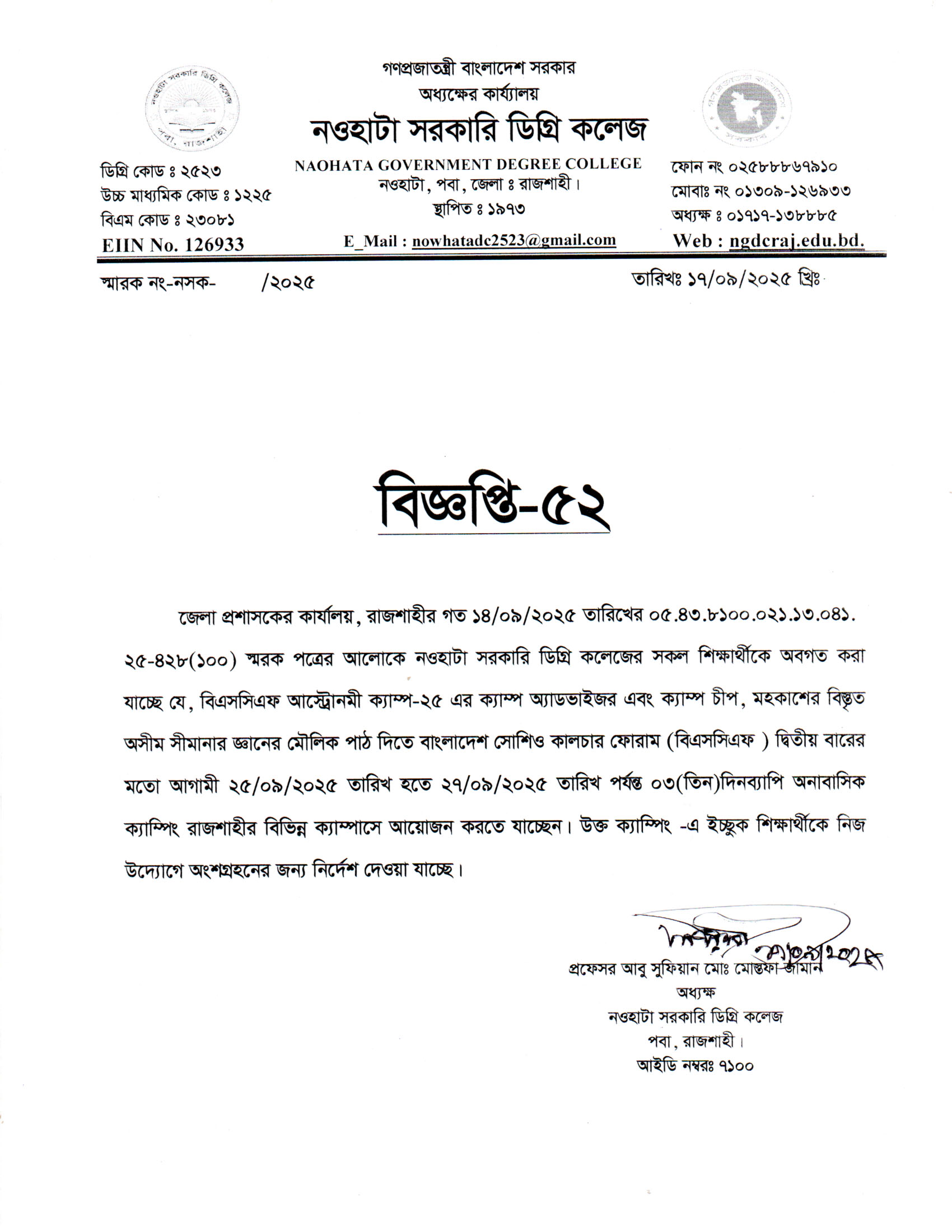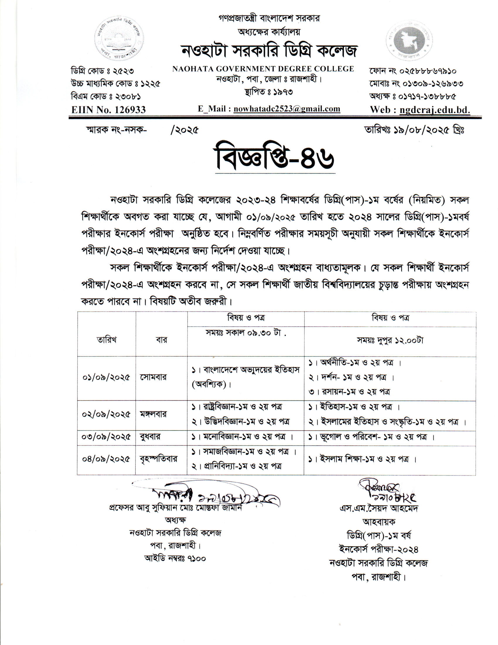 নওহাটা সরকারি ডিগ্রি কলেজের সকল শিক্ষার্থীর অবগতির জন্য |