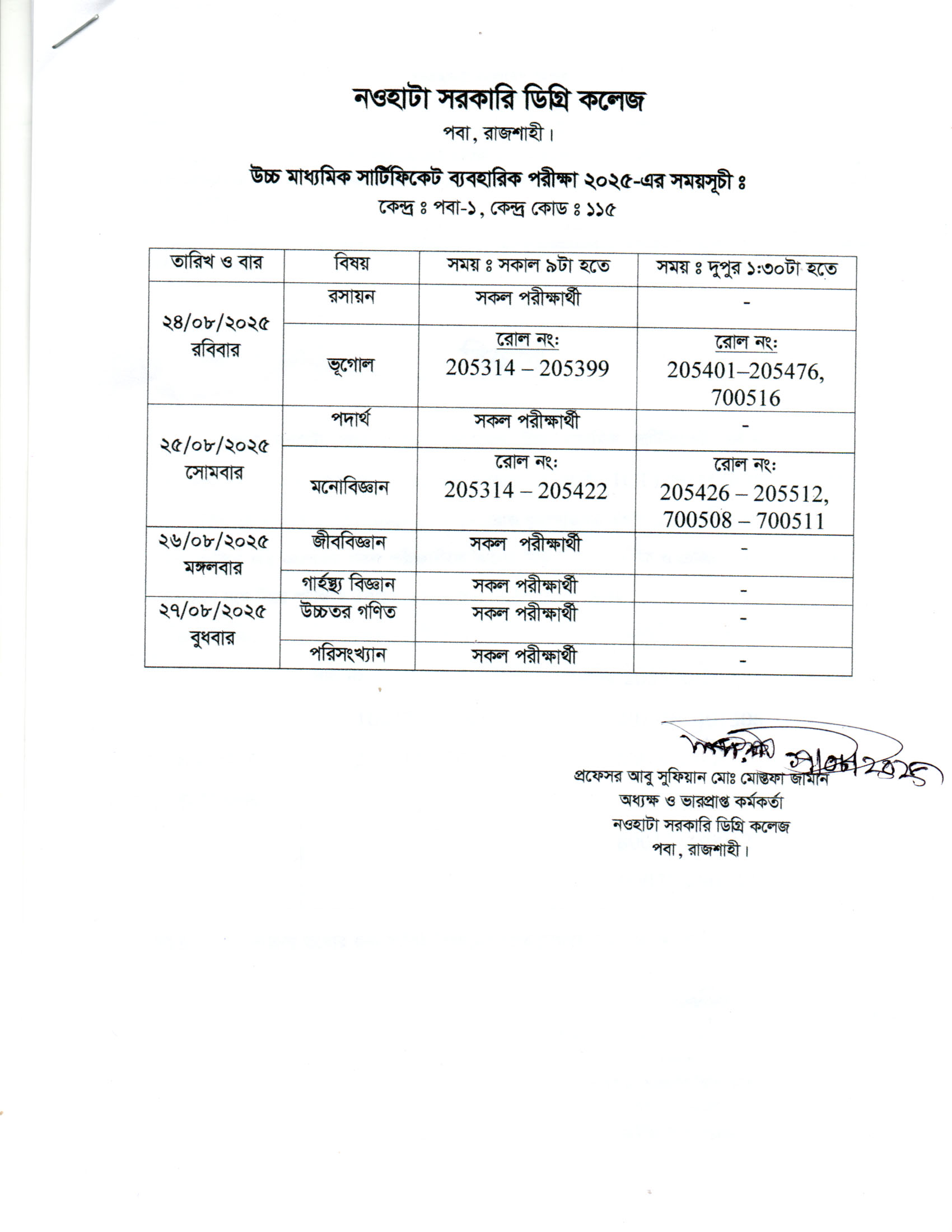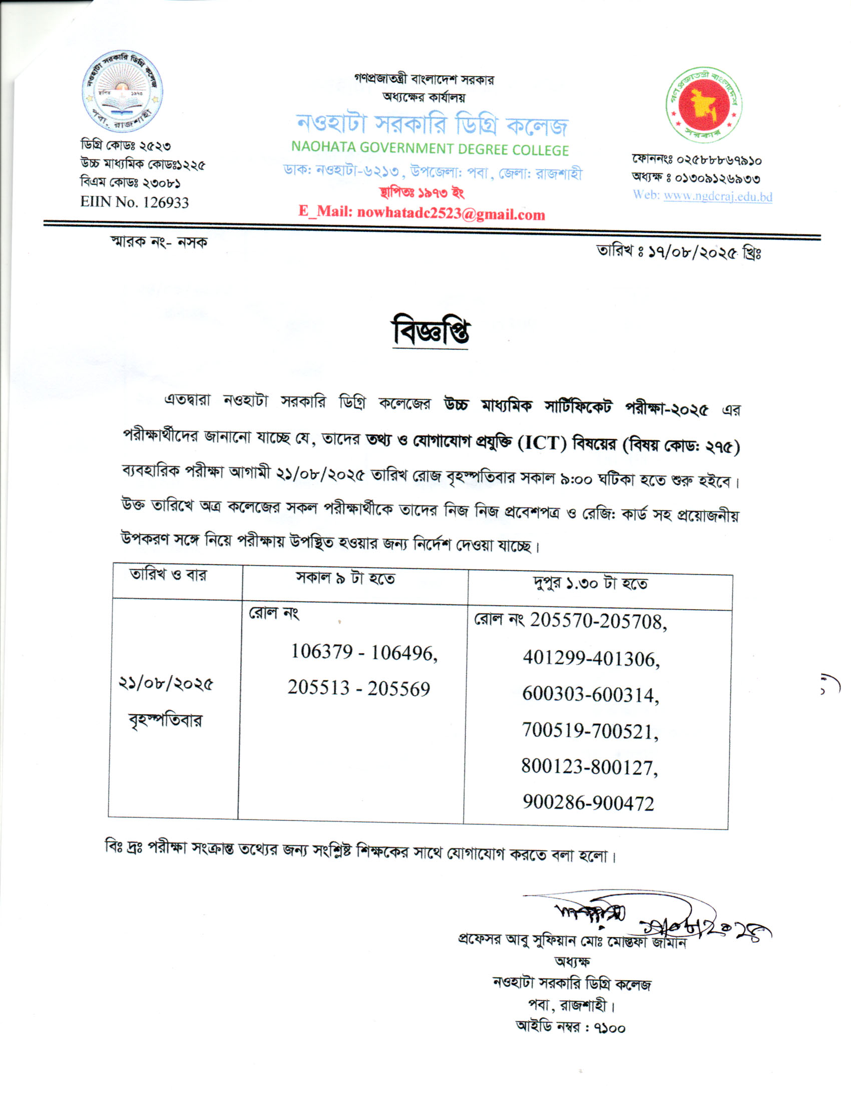 নওহাটা সরকারি ডিগ্রি কলেজ এর উচ্চ মাধ্যমিক পরীক্ষার্থী (ICT ব্যবহারিক)-২০২৫ এর সময় সূচি |