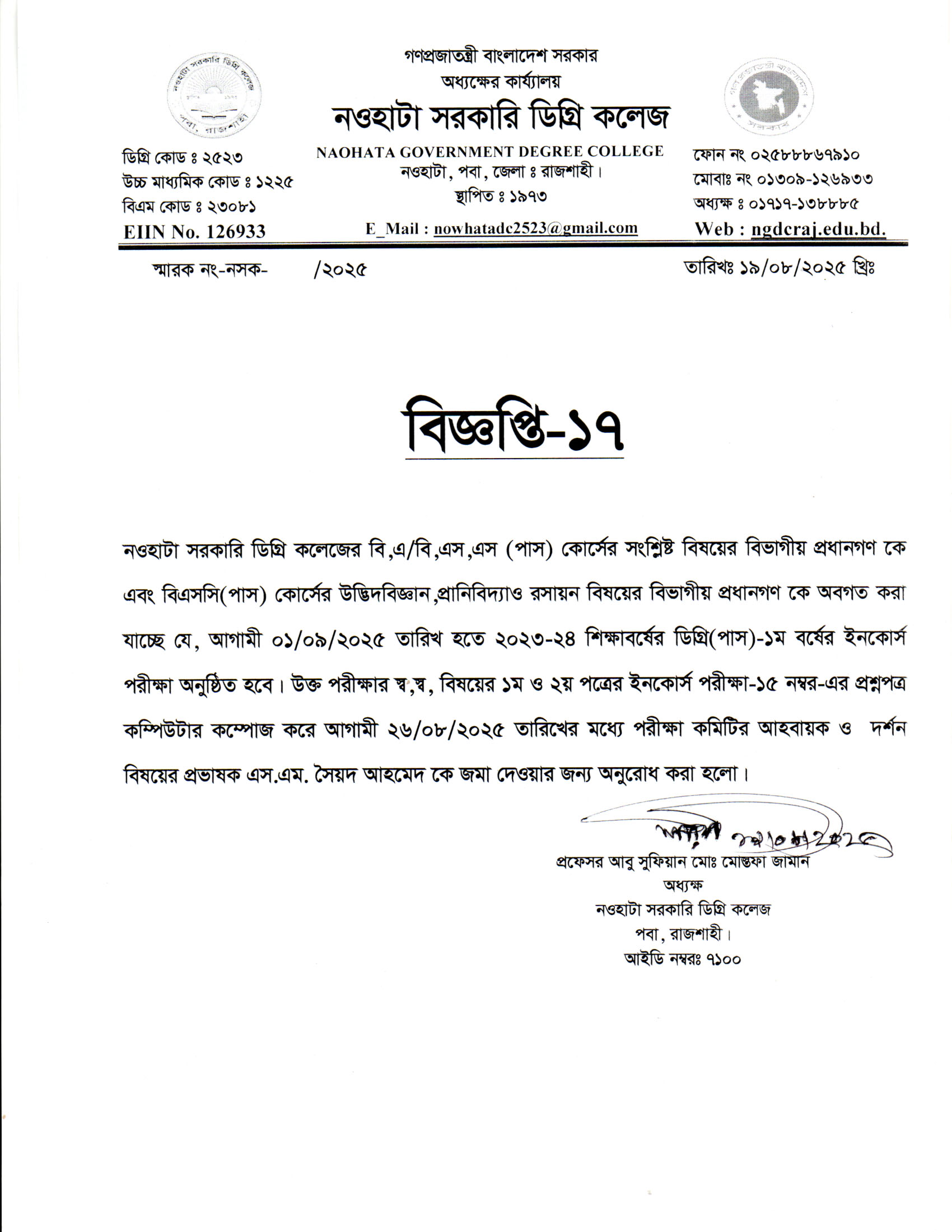 নওহাটা সরকারি ডিগ্রি কলেজের 2023-24 শিক্ষাবর্ষের ডিগ্রি (পাস) ১ম বর্ষের ইনকোর্স পরীক্ষা সংক্রান্ত। |