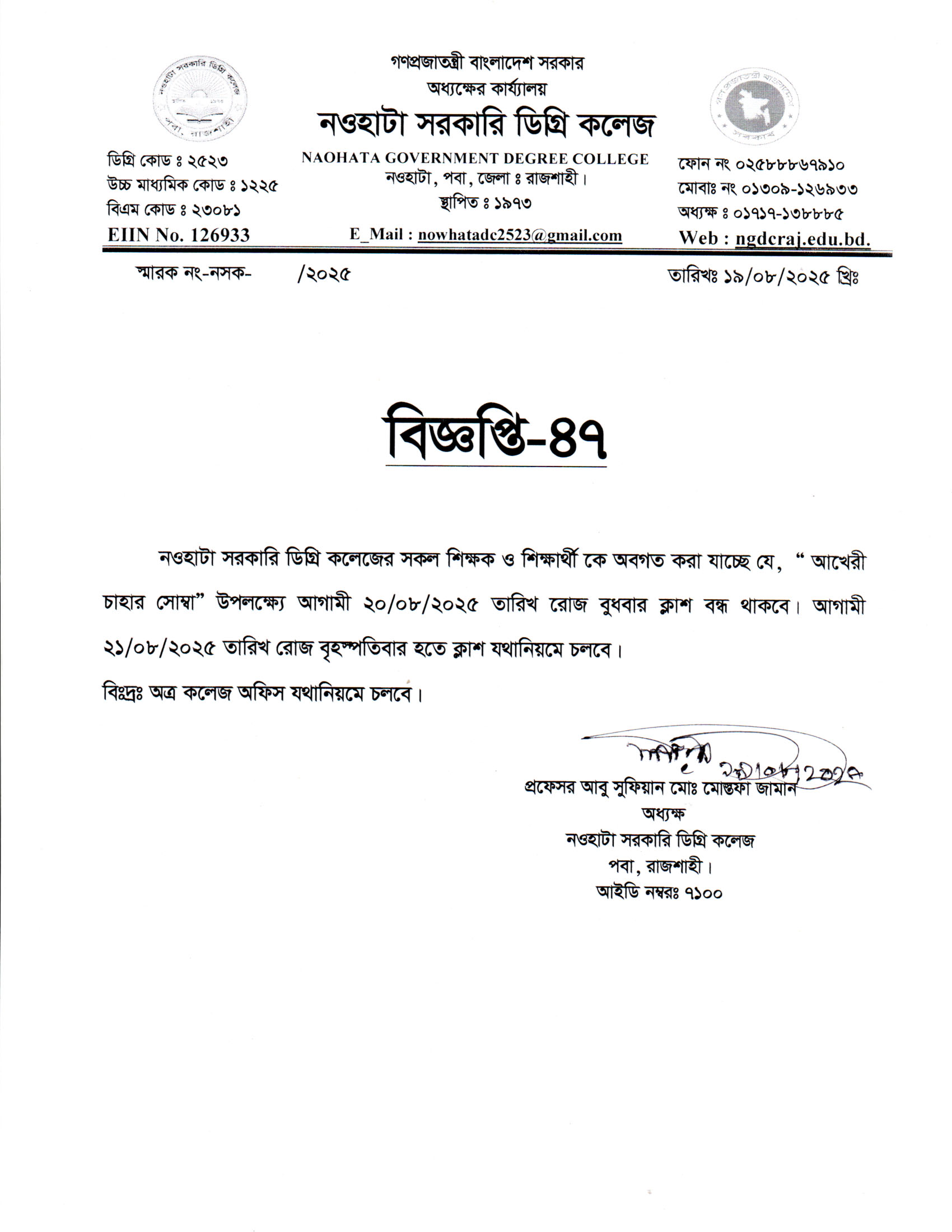 “আখেরী চাহারা সোম্বা” উপলক্ষ্যে ক্লাস বন্ধ থাকা সংক্রান্ত। |