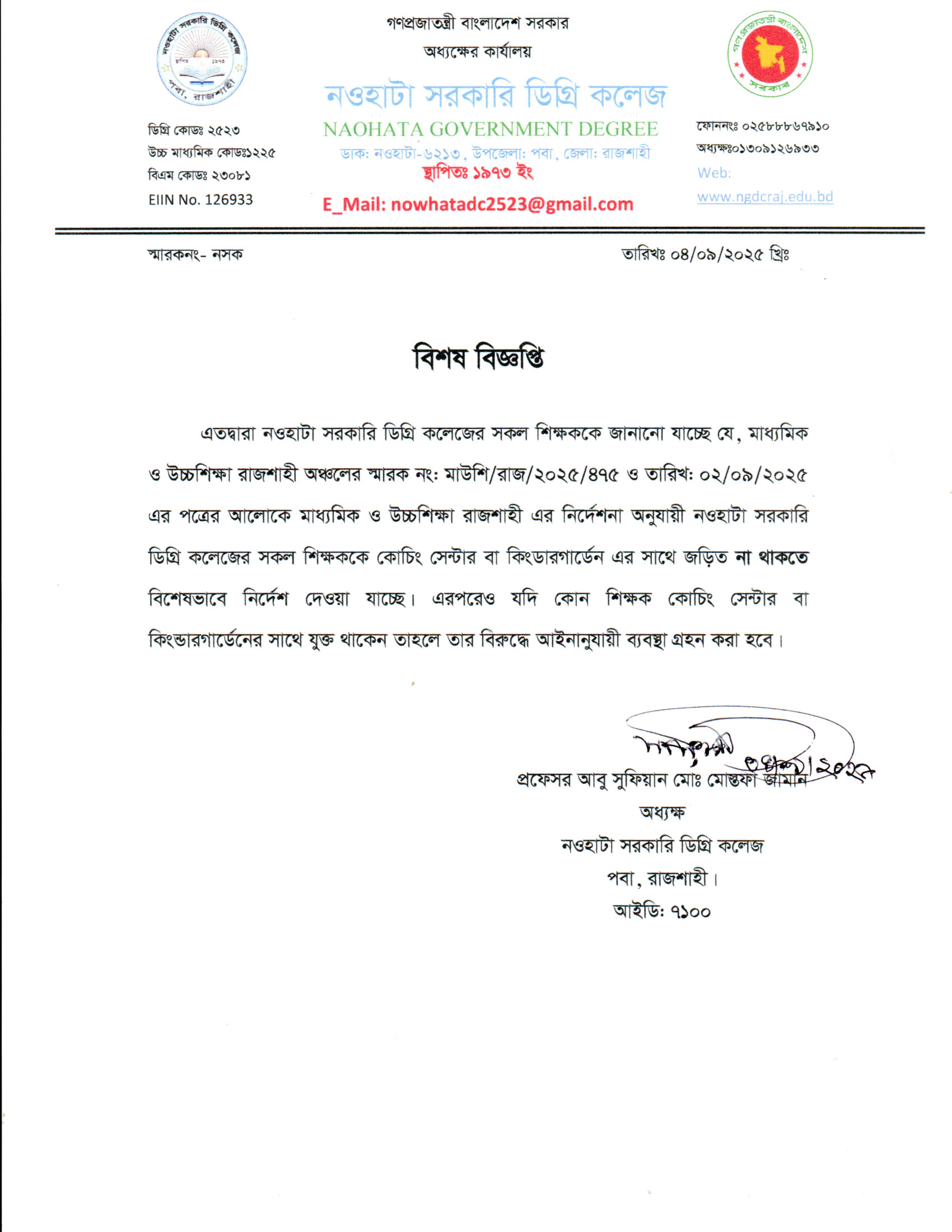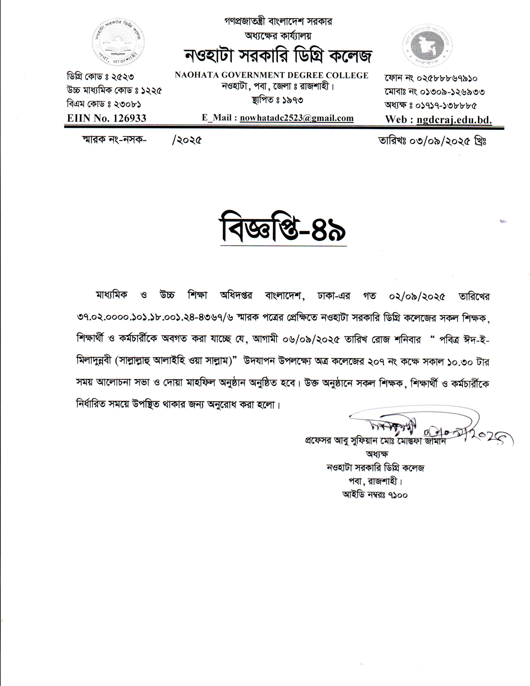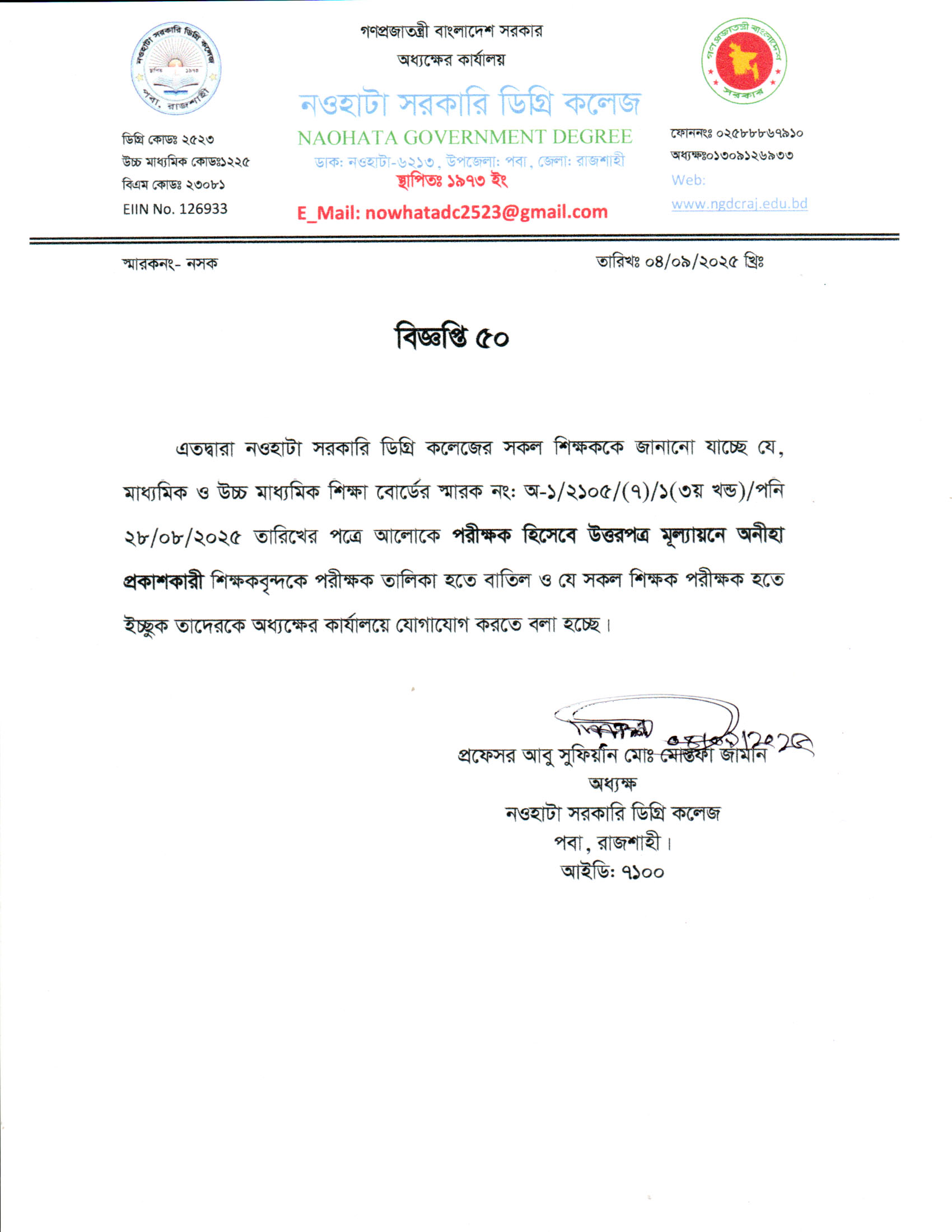 নওহাটা সরকারি ডিগ্রি কলেজের সকল শিক্ষকের অবগতির জন্য |