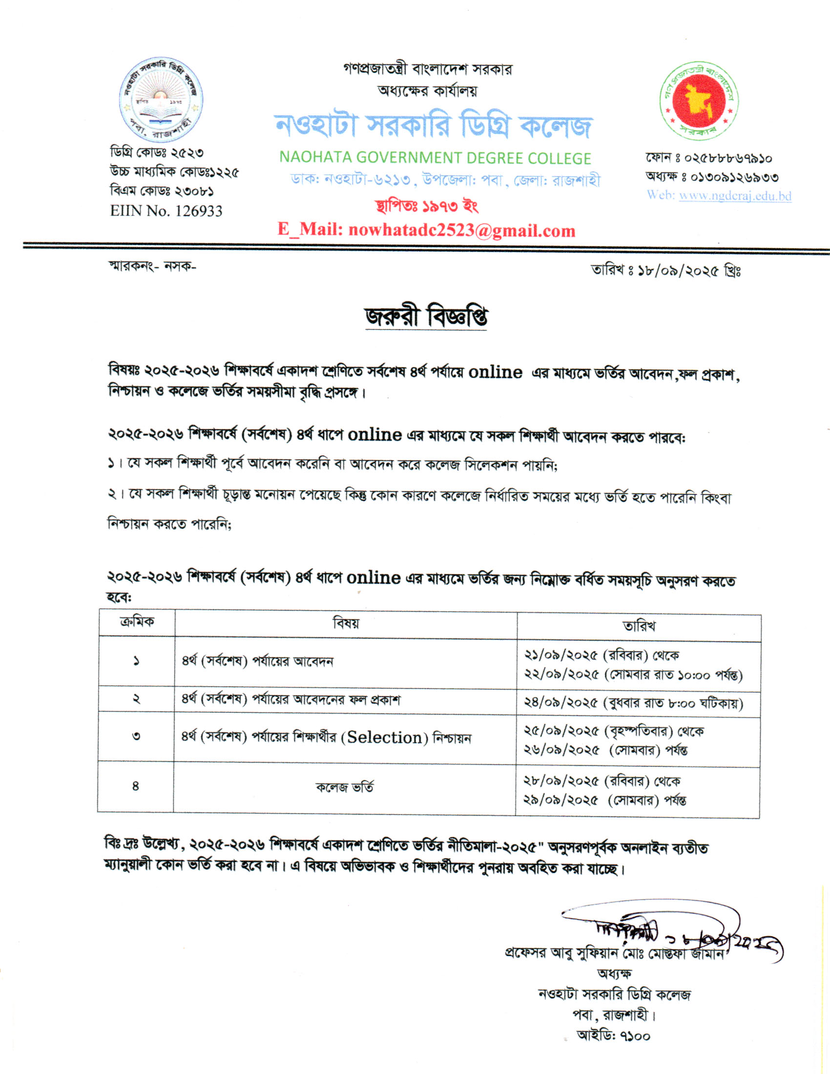 ২০২৫-২০২৬ শিক্ষাবর্ষে একাদশ শ্রেণিতে সর্বশেষ ৪র্থ পর্যায়ে অনলাইন এর মাধ্যমে ভর্তির আবেদন,ফল প্রকাশ, নিশ্চায়ন ও কলেজে ভর্তির সময়সীমা বৃদ্ধি প্রসঙ্গে। |