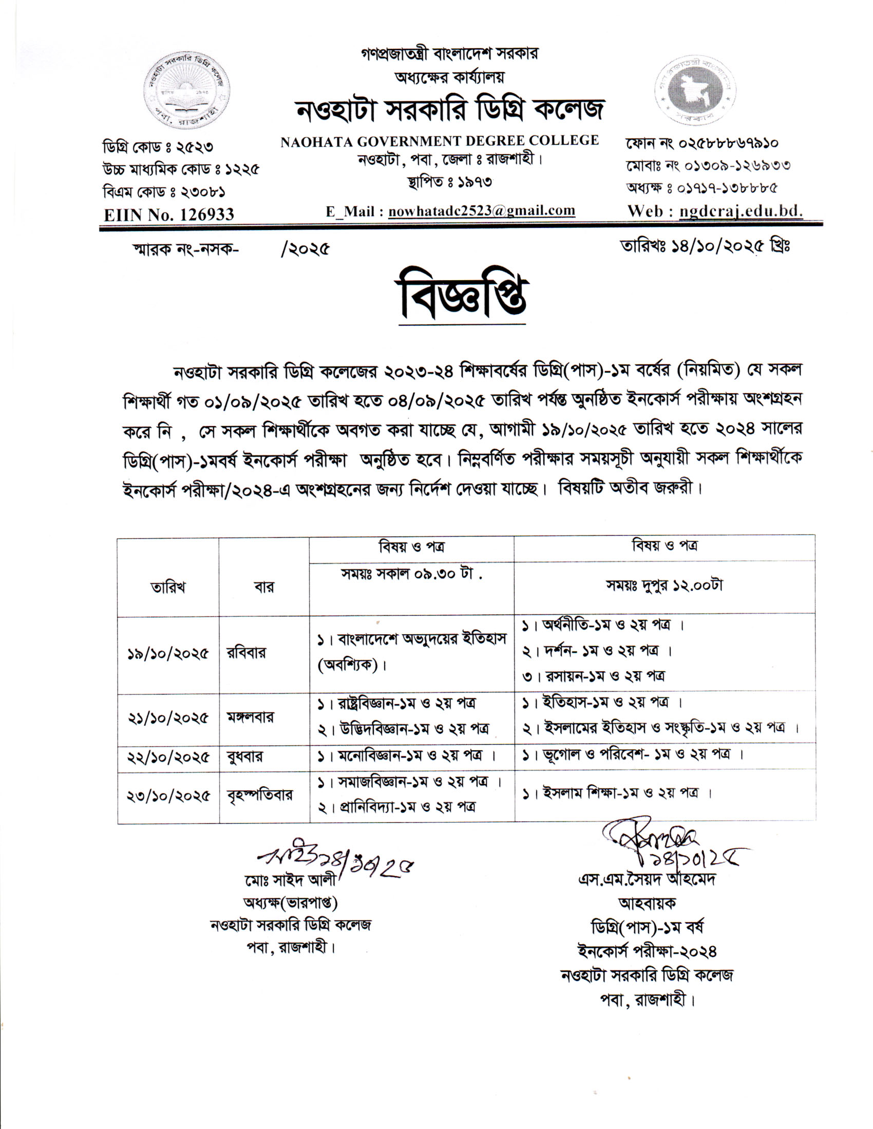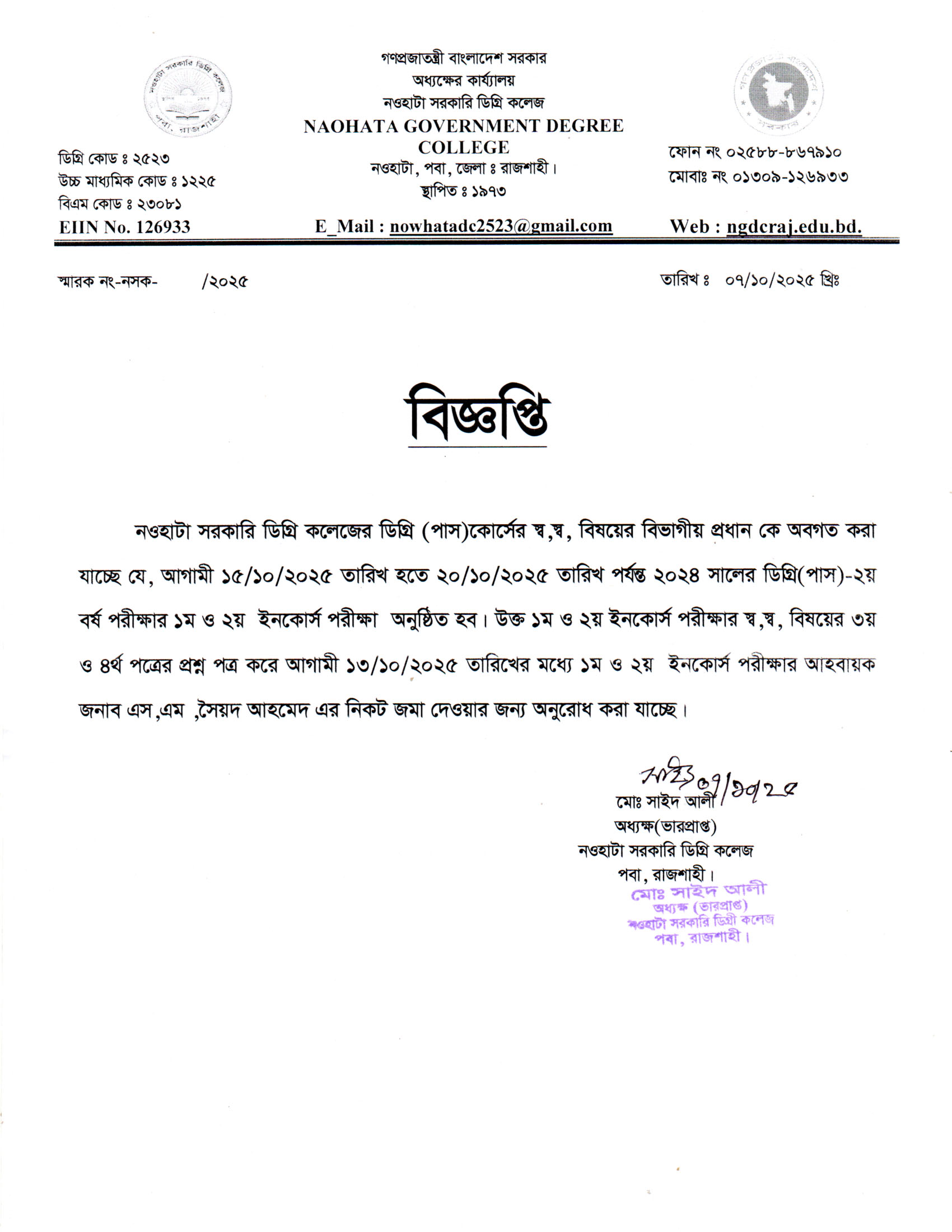 নওহাটা সরকারি ডিগ্রি কলেজের ২০২২-২৩ শিক্ষাবর্ষ ডিগ্রি (পাস) ২য় বর্ষের শিক্ষার্থীদের ইনকোর্স পরীক্ষা সংক্রান্ত |