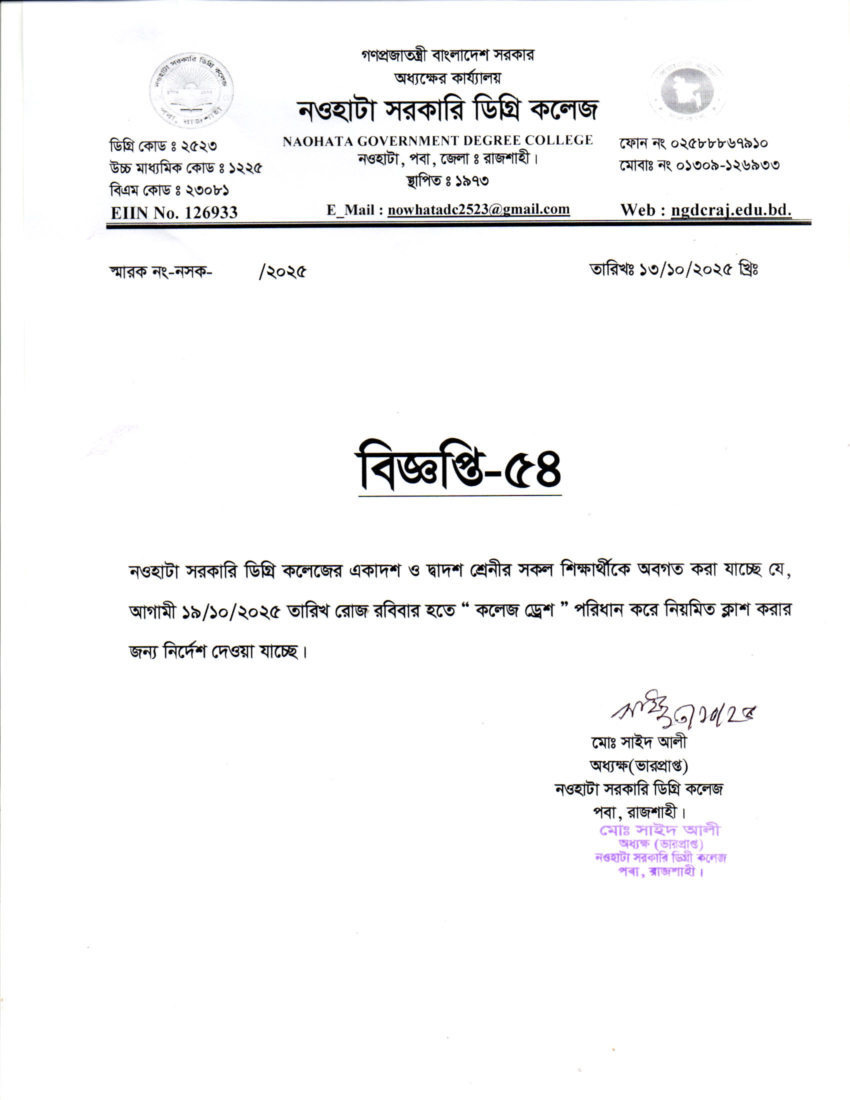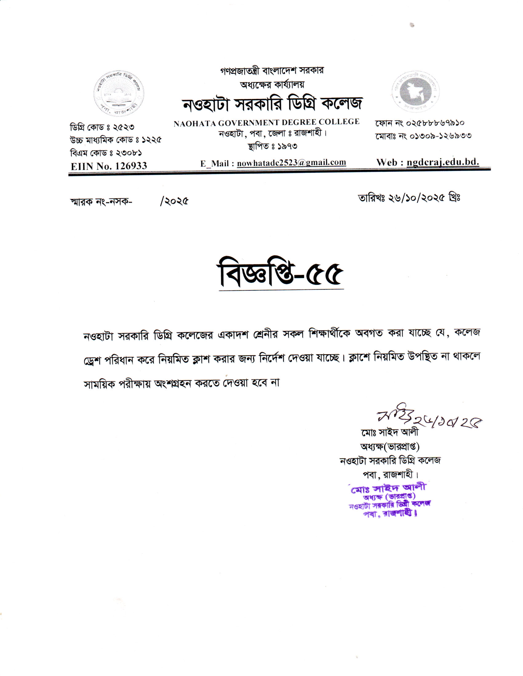 নওহাটা সরকারি ডিগ্রি কলেজের উচ্চমাধ্যমিক একাদশ ও দ্বাদশ শ্রেণির সকল শিক্ষার্থীদের কলেজ ড্রেস পরে ক্লাস করার নির্দেশ |