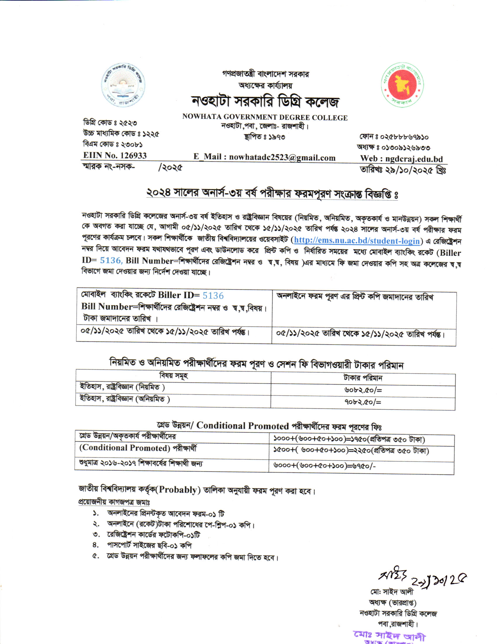 ২০২৪ সালের অনার্স ৩য় বর্ষ পরীক্ষার ফরমপূরণ সংক্রান্ত বিজ্ঞপ্তি। |