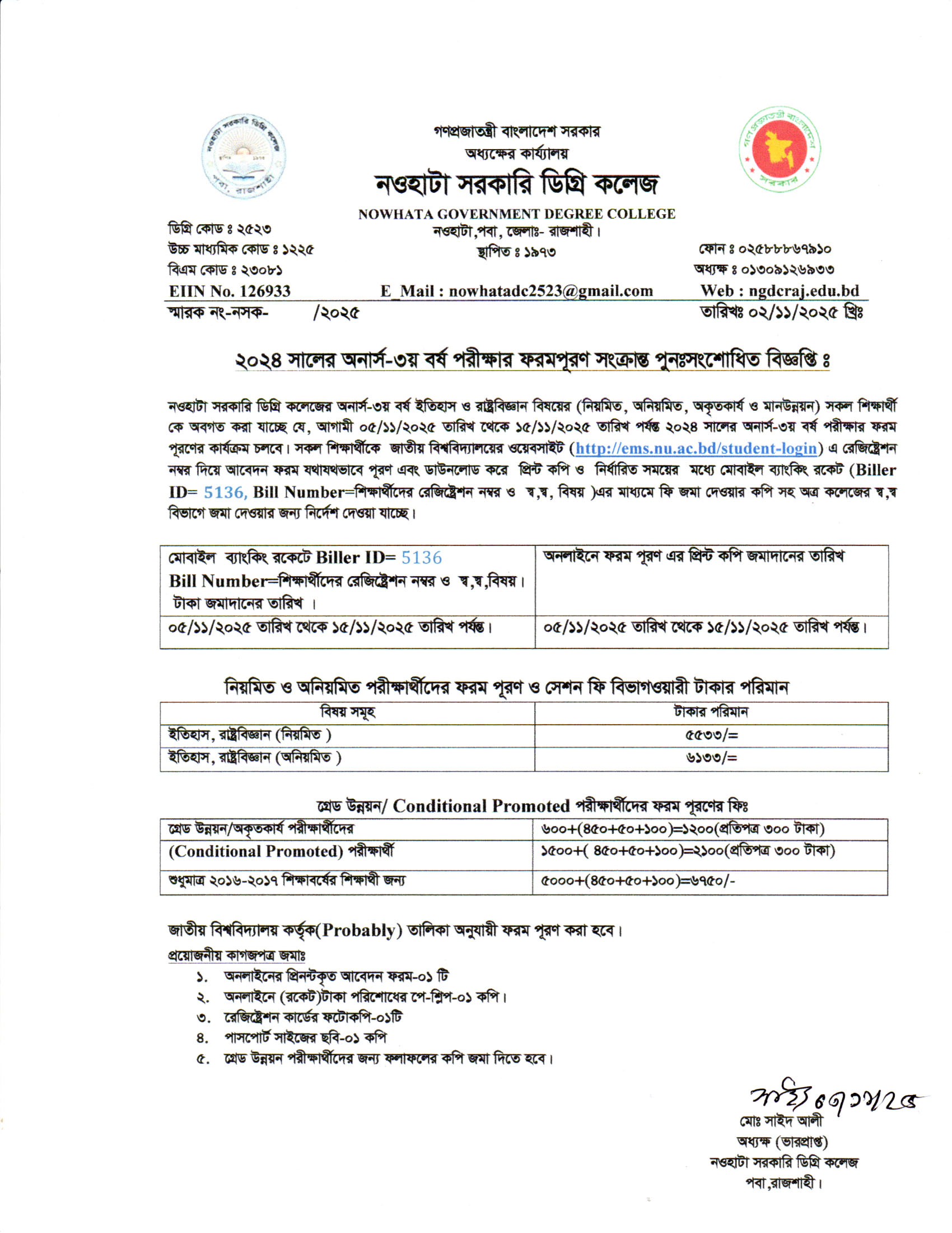 ২০২৪ সালের অনার্স ৩য় বর্ষ পরীক্ষার ফরম পূরণের পুনঃসংশোধিত বিজ্ঞপ্তি |