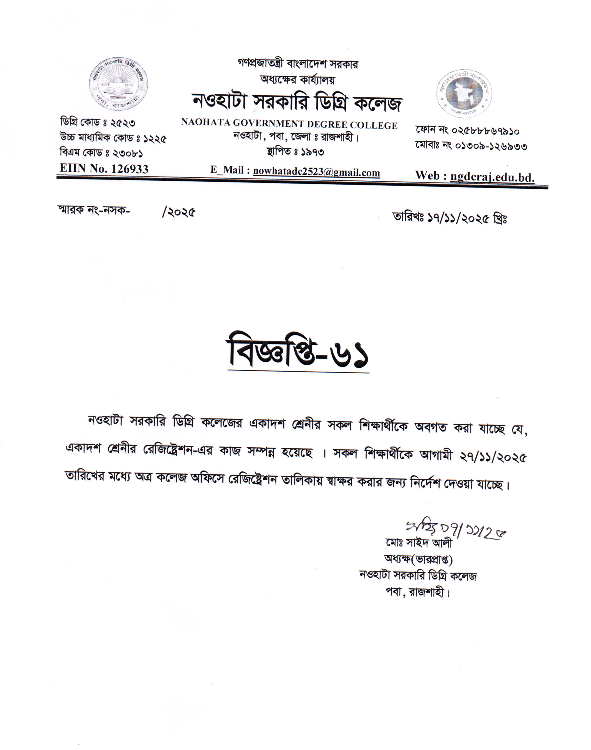 নওহাটা সরকারি ডিগ্রি কলেজের একাদশ শ্রেণির সকল শিক্ষার্থীর অবগতীর জন্য। |