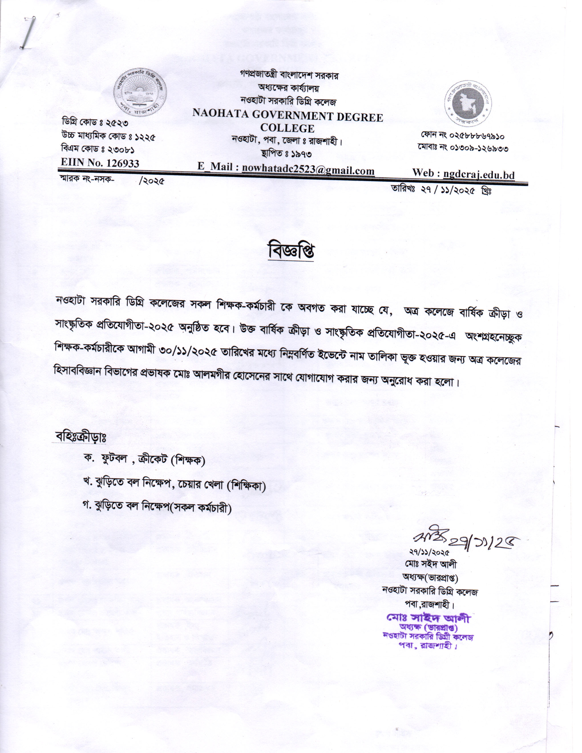 নওহাটা সরকারি ডিগ্রি কলেজের সকল শিক্ষক-কর্মচারীদের অবগতি করা যাচ্ছে |