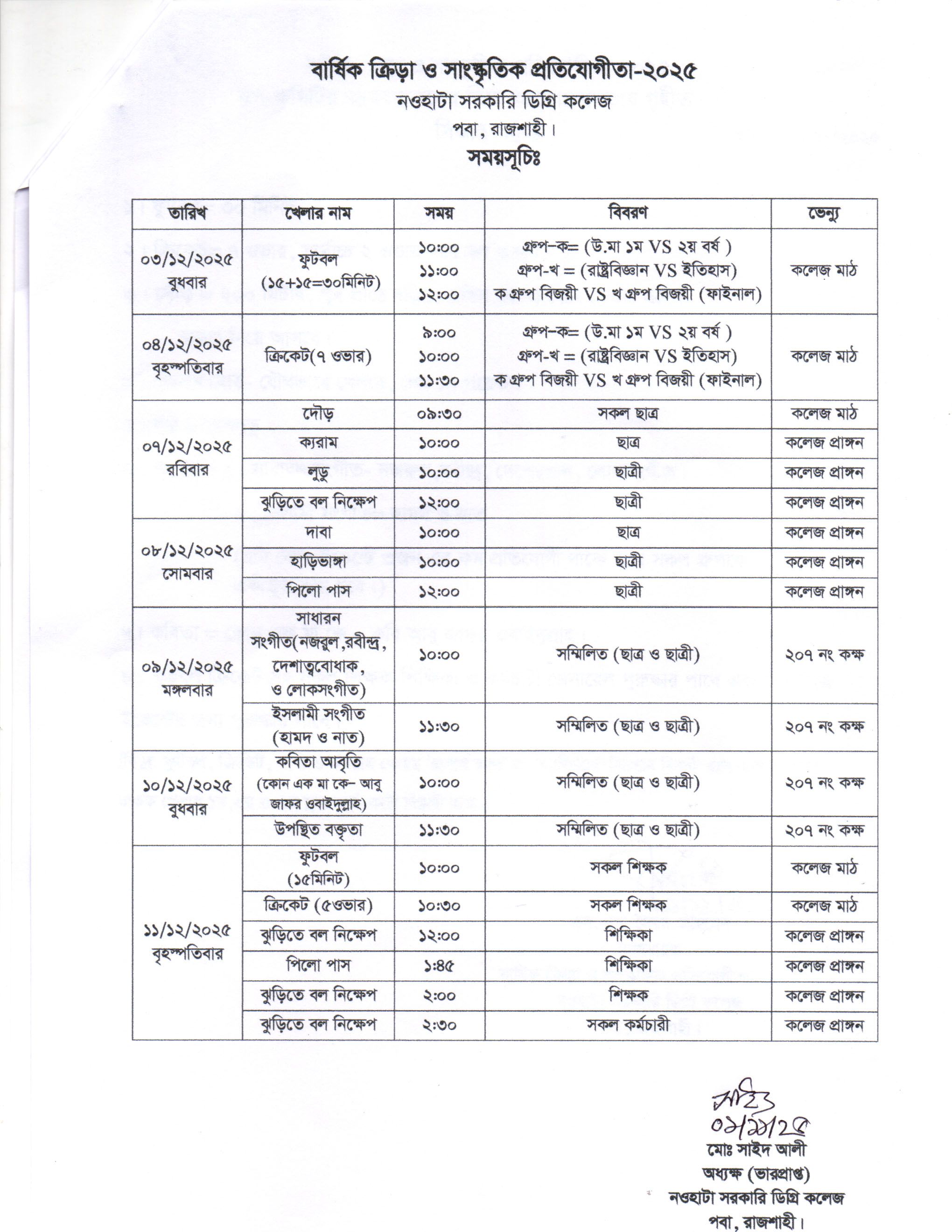 ”বার্ষিক ক্রিড়া ও সাংস্কৃতিক অনুষ্ঠান-২০২৫” এর সময়সূচি |