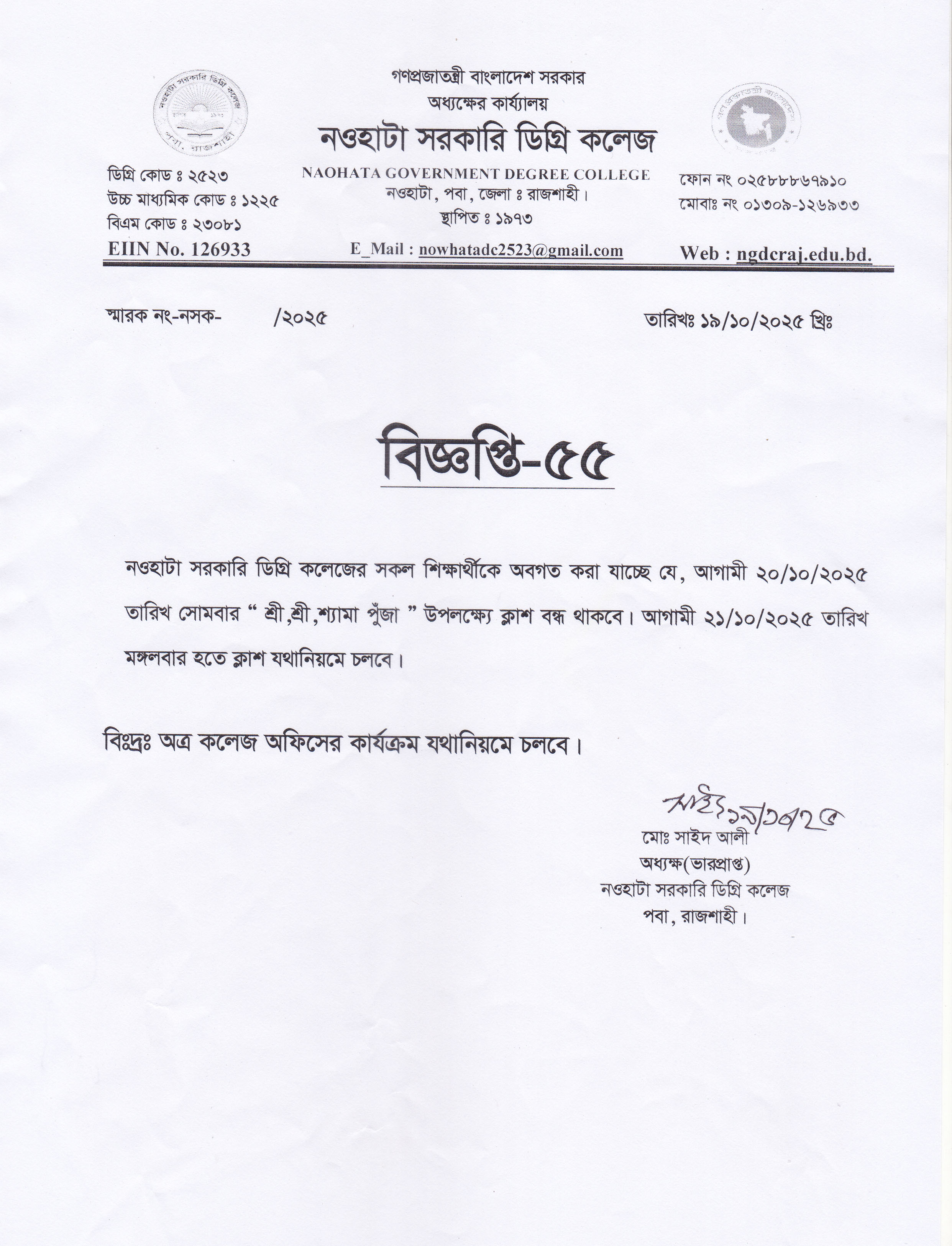 নওহাটা সরকারি ডিগ্রি কলেজের সকল শিক্ষার্থীর অবগতির জন্য