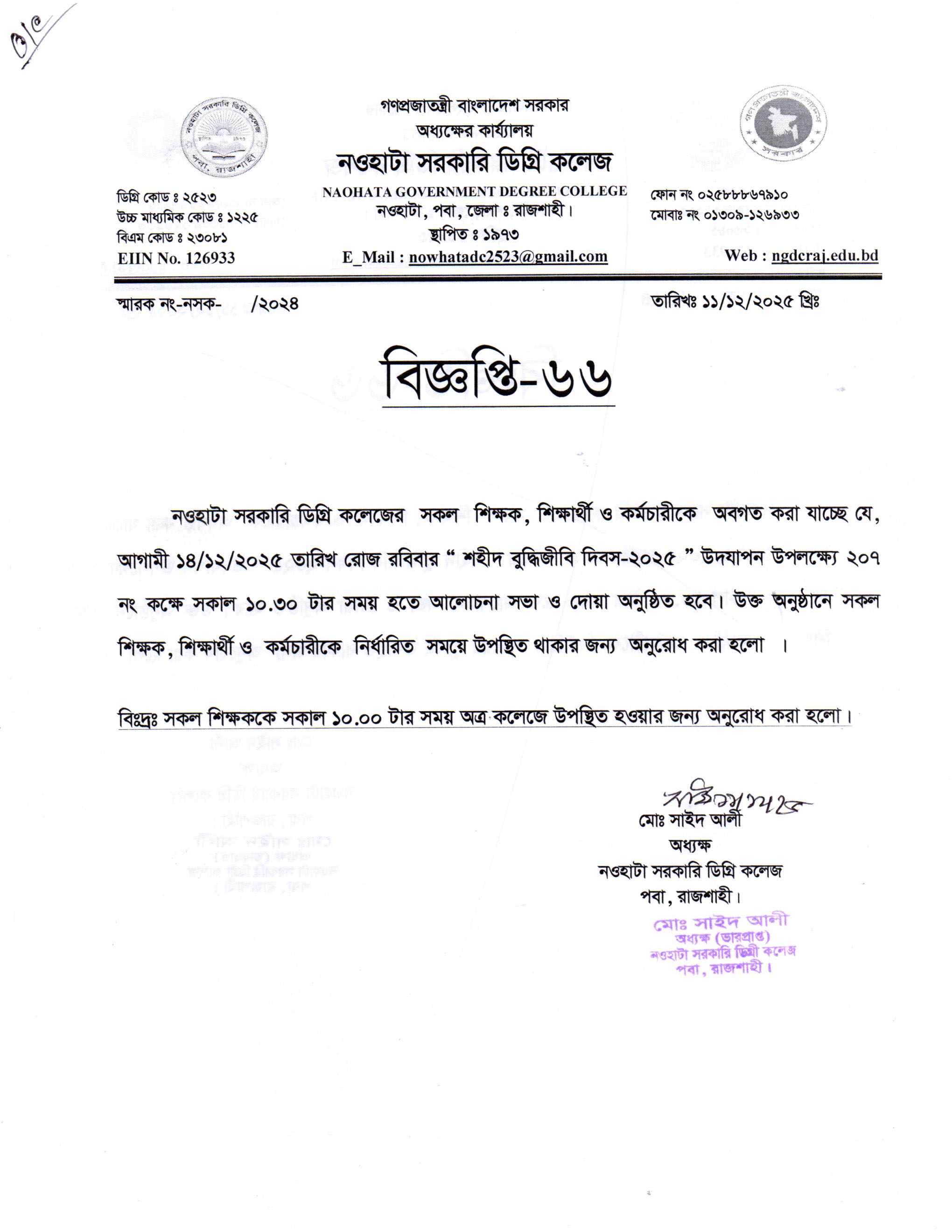 “শহীদ বুদ্ধিজীবি দিবস-2025” উদযাপন  উপলক্ষ্যে
