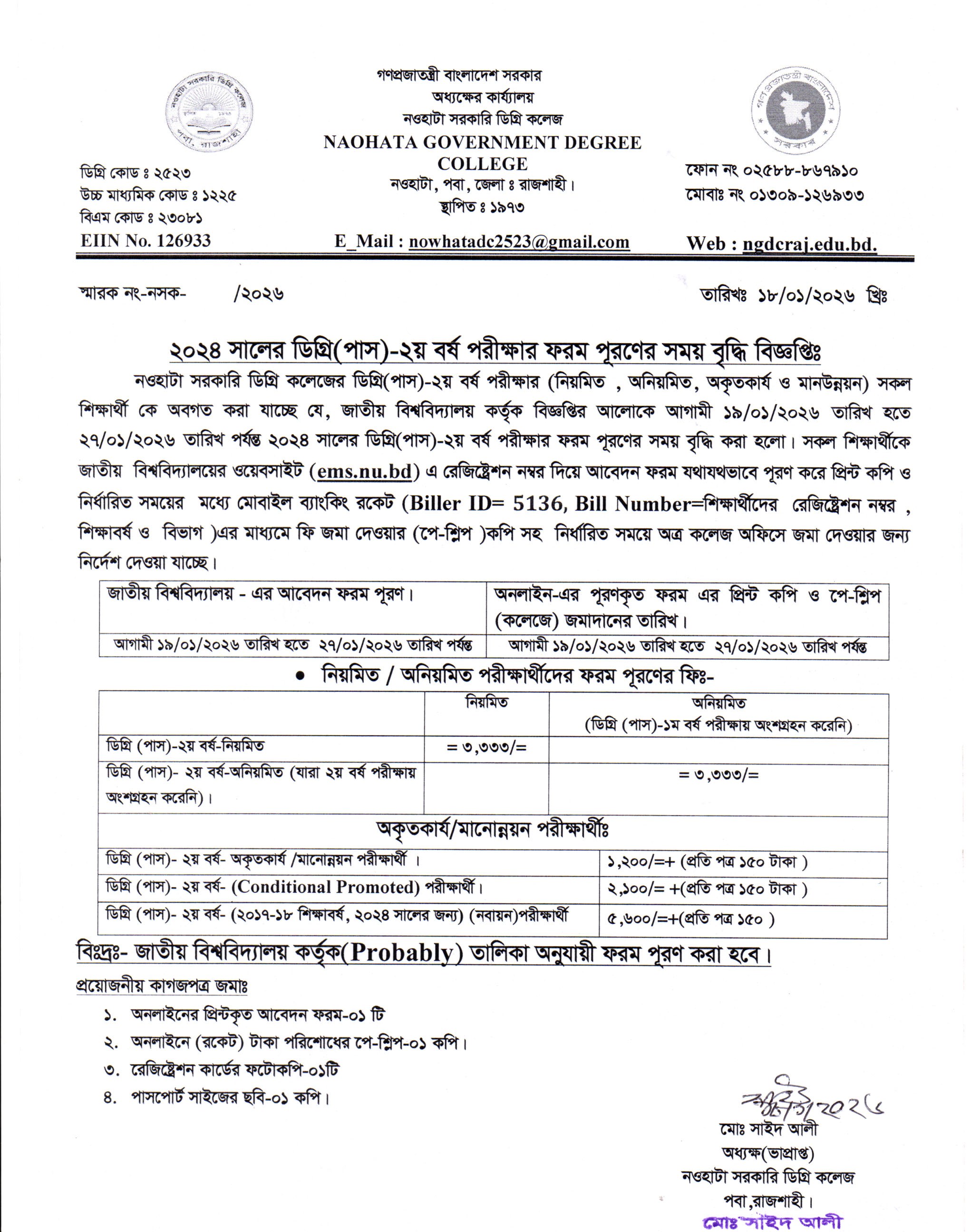 ২০২৪ সালের ডিগ্রি (পাস)-২য় বর্ষ পরীক্ষার ফরম পূরণের সময় বৃদ্ধি বিজ্ঞপ্তিঃ |