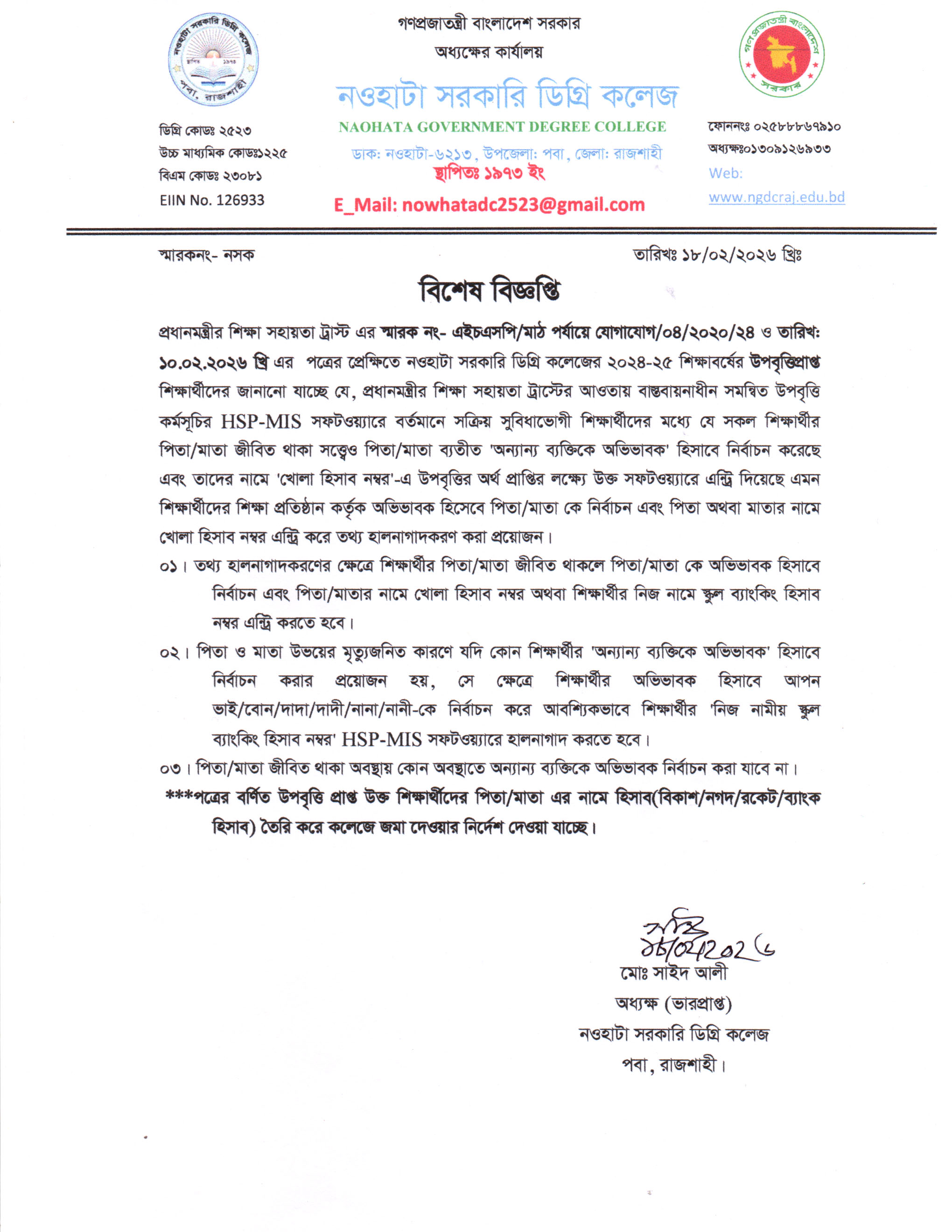 নওহাটা সরকারি ডিগ্রি কলেজটি রাজশাহী জেলা সদর থেকে মাত্র ১০ কি:মি: দূরে রাজশাহী নওগাঁ মহাসড়কের ধারে শাহ্মখদুম বিমানবন্দরের উত্তরদিকে নওহাটা নামক স্থানে একটি মনোরম পরিবেশে অবস্থিত। ১৯৭৩ সালে প্রতিষ্ঠিত কলেজটির তখন নাম ছিল নওহাটা মহাবিদ্যালয়। প্রধানমন্ত্রী জননেত্রী শেখ হাসিনার প্রতি উপজেলায় একটি করে কলেজ সরকারি করণের ঘোষনার ফলে ২০১৮ সালের ৮ আগষ্ট কলেজটি “নওহাটা সরকারি ডিগ্রি কলেজ” নামে গেজেটভুক্ত হয়। ...