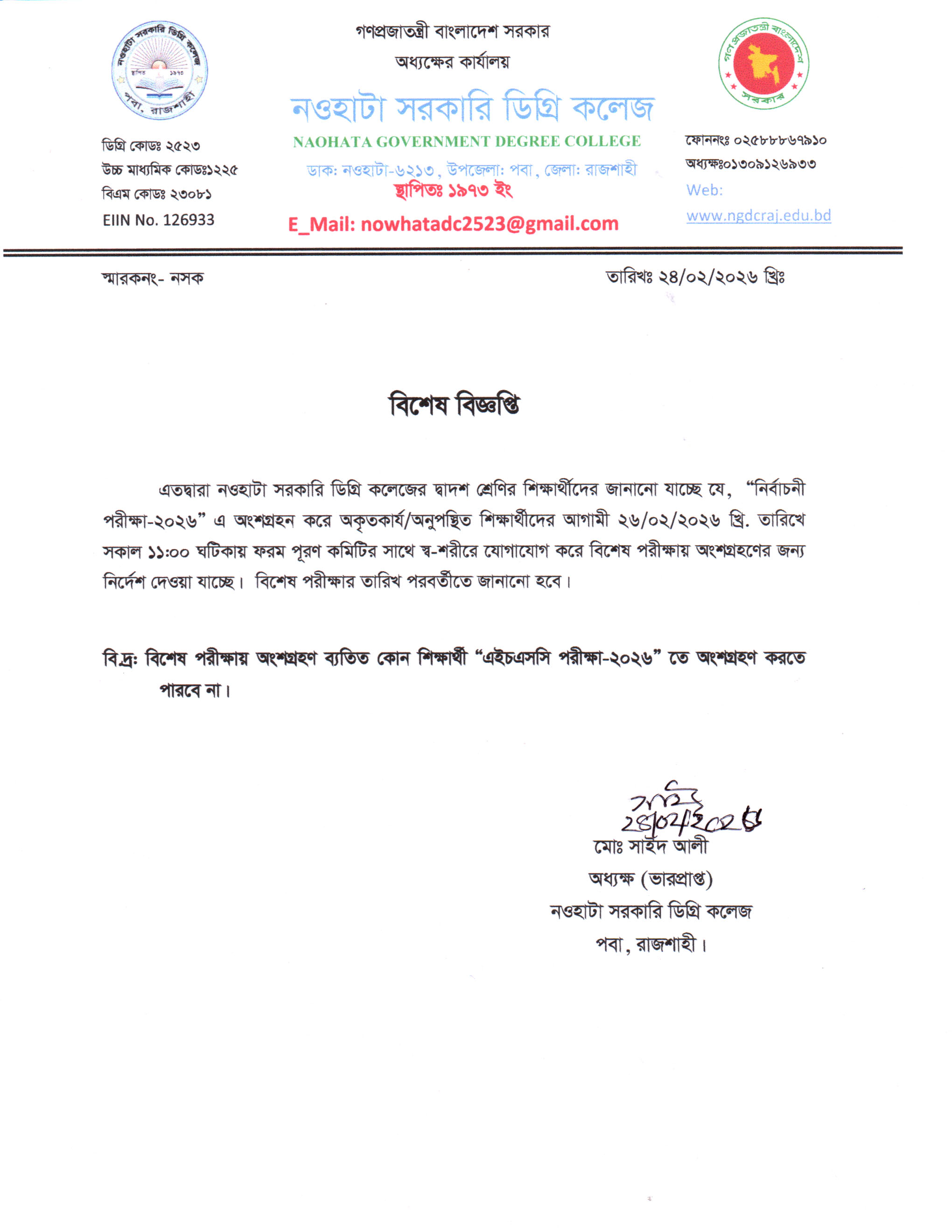 নওহাটা সরকারি ডিগ্রি কলেজটি রাজশাহী জেলা সদর থেকে মাত্র ১০ কি:মি: দূরে রাজশাহী নওগাঁ মহাসড়কের ধারে শাহ্মখদুম বিমানবন্দরের উত্তরদিকে নওহাটা নামক স্থানে একটি মনোরম পরিবেশে অবস্থিত। ১৯৭৩ সালে প্রতিষ্ঠিত কলেজটির তখন নাম ছিল নওহাটা মহাবিদ্যালয়। প্রধানমন্ত্রী জননেত্রী শেখ হাসিনার প্রতি উপজেলায় একটি করে কলেজ সরকারি করণের ঘোষনার ফলে ২০১৮ সালের ৮ আগষ্ট কলেজটি “নওহাটা সরকারি ডিগ্রি কলেজ” নামে গেজেটভুক্ত হয়। ...