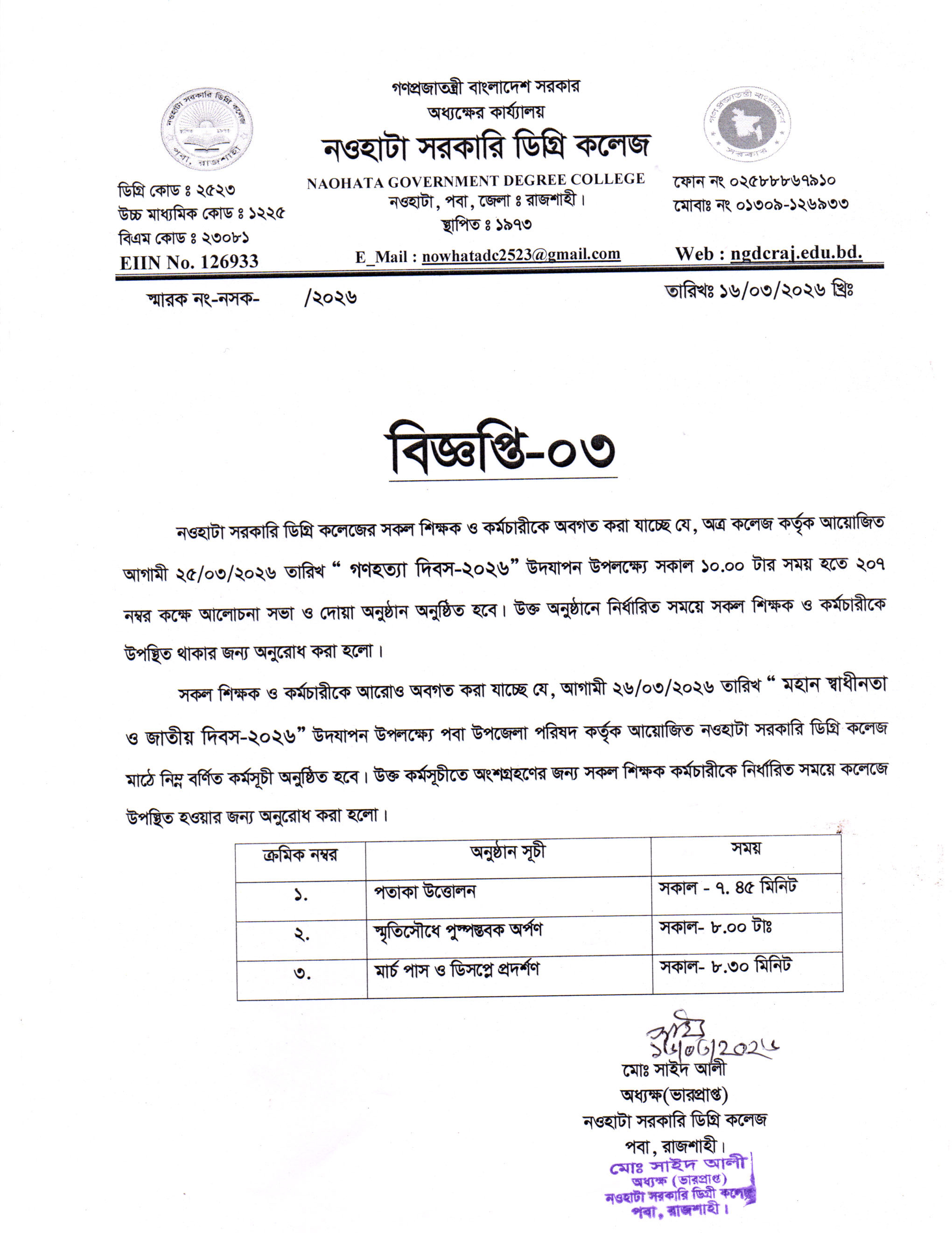 “২৫ শে মার্চ গণহত্যা দিবস ও ২৬ মার্চ স্বাধীনতা দিবস -২০২৬” উদযাপন সংক্রান্ত বিজ্ঞপ্তি