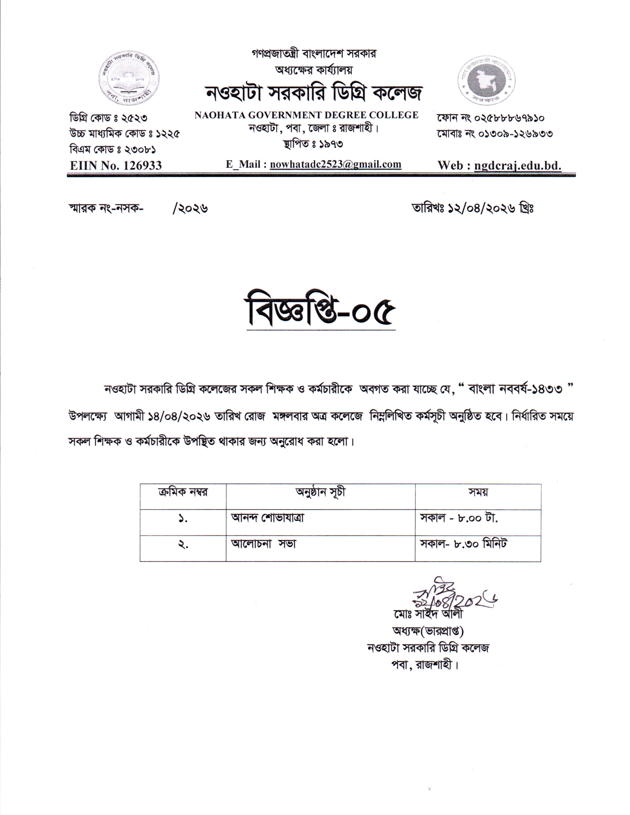 নওহাটা সরকারি ডিগ্রি কলেজটি রাজশাহী জেলা সদর থেকে মাত্র ১০ কি:মি: দূরে রাজশাহী নওগাঁ মহাসড়কের ধারে শাহ্মখদুম বিমানবন্দরের উত্তরদিকে নওহাটা নামক স্থানে একটি মনোরম পরিবেশে অবস্থিত। ১৯৭৩ সালে প্রতিষ্ঠিত কলেজটির তখন নাম ছিল নওহাটা মহাবিদ্যালয়। প্রধানমন্ত্রী জননেত্রী শেখ হাসিনার প্রতি উপজেলায় একটি করে কলেজ সরকারি করণের ঘোষনার ফলে ২০১৮ সালের ৮ আগষ্ট কলেজটি “নওহাটা সরকারি ডিগ্রি কলেজ” নামে গেজেটভুক্ত হয়। ...