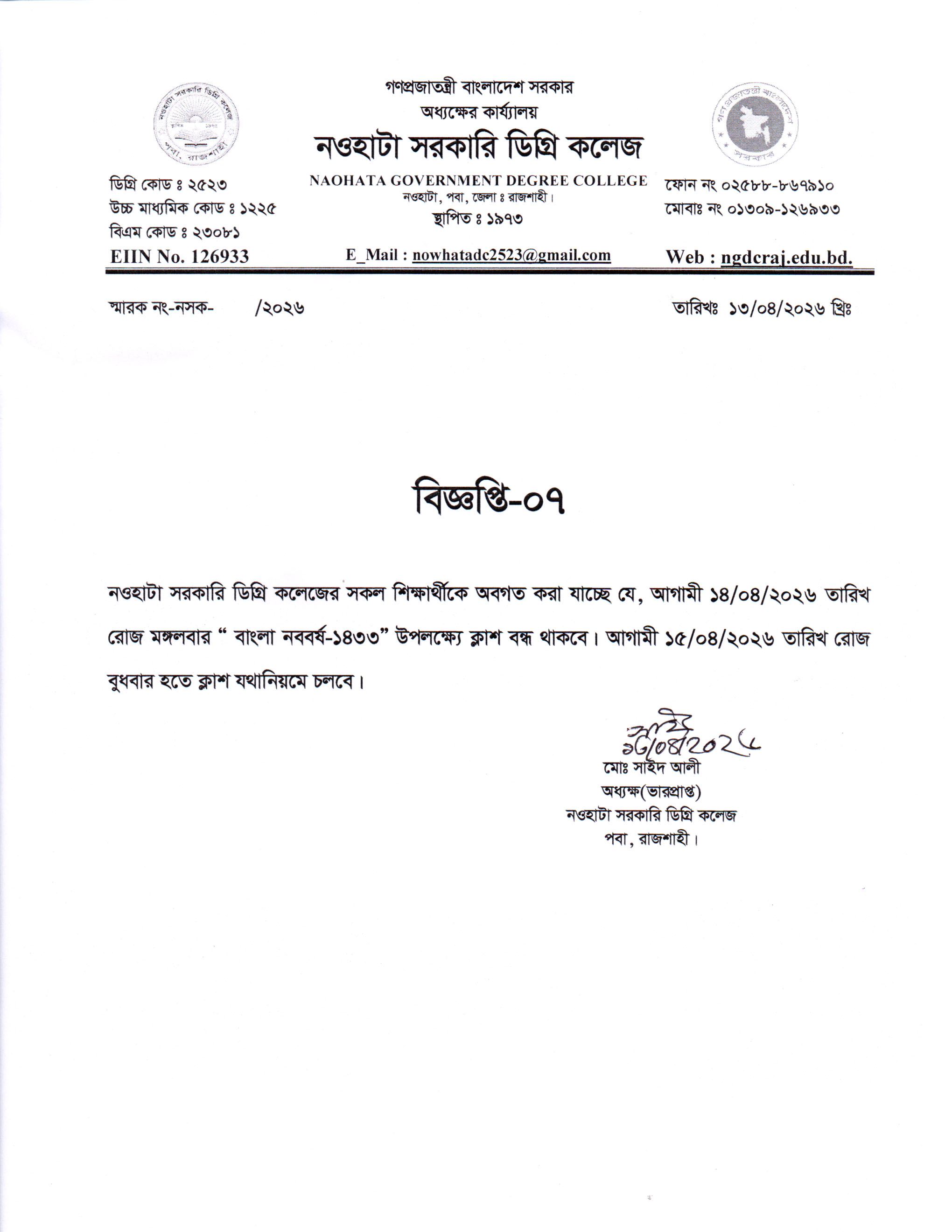 “বাংলা নববর্ষ-১৪৩৩” উপলক্ষ্যে ক্লাস বন্ধ থাকা সংক্রান্ত বিজ্ঞপ্তি